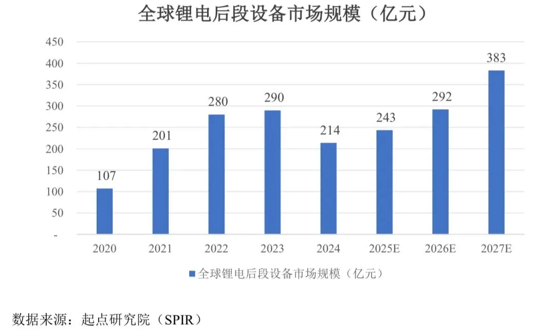 根据起点研究院(SPIR)数据,预计到 2027 年全球锂电设备市场规模达 1,419 亿元,其中前段设备市场规模为 460 亿元,中段设备市场规模为 434 亿元,后段设备市场规模为383 亿元,模组及 Pack 市场规模为142 亿元。