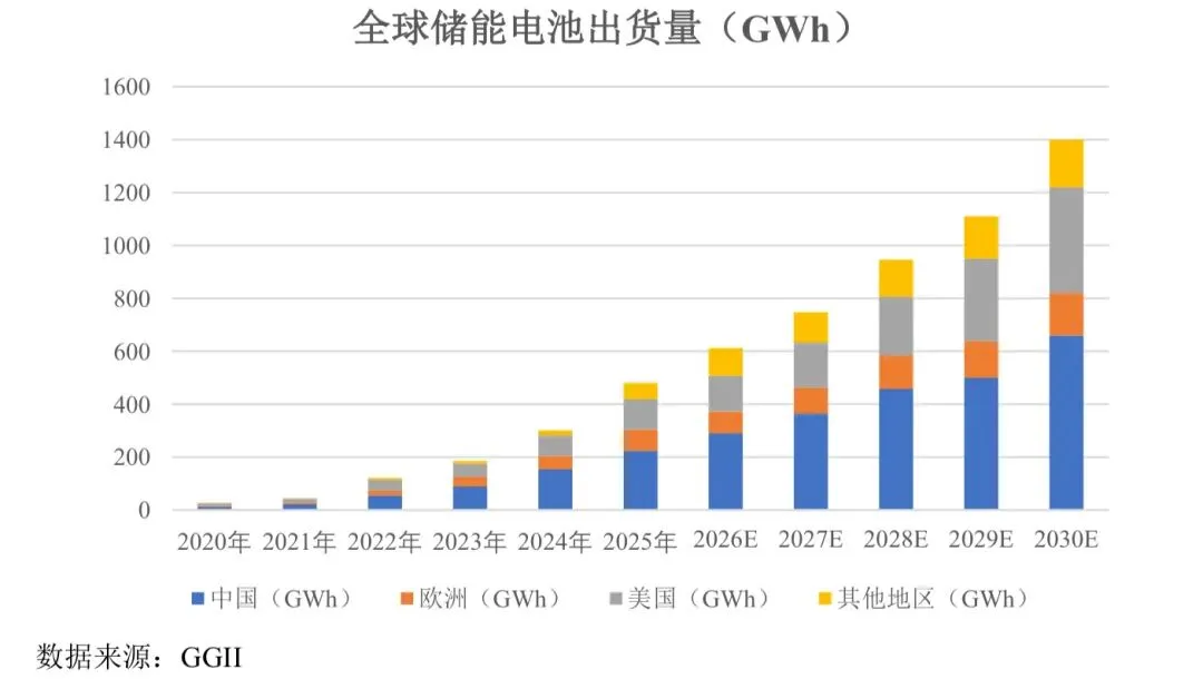 全球储能电池出货量以82.7%的复合年增长率从2020 年的27GWh 大幅提升至 2024 年的 301GWh,预计在 2030 年达到 1,400GWh。2024-2030 年间,复合年增长率将保持在29.2%的高位。新能源消纳压力、工商业储能投资回报周期的缩短及用户侧峰谷电价差异的扩大共同催生储能需求。同时,工商业储能及数据中心储能等应用场景不断扩展,共同推动全球储能电池出货量迅猛增长。