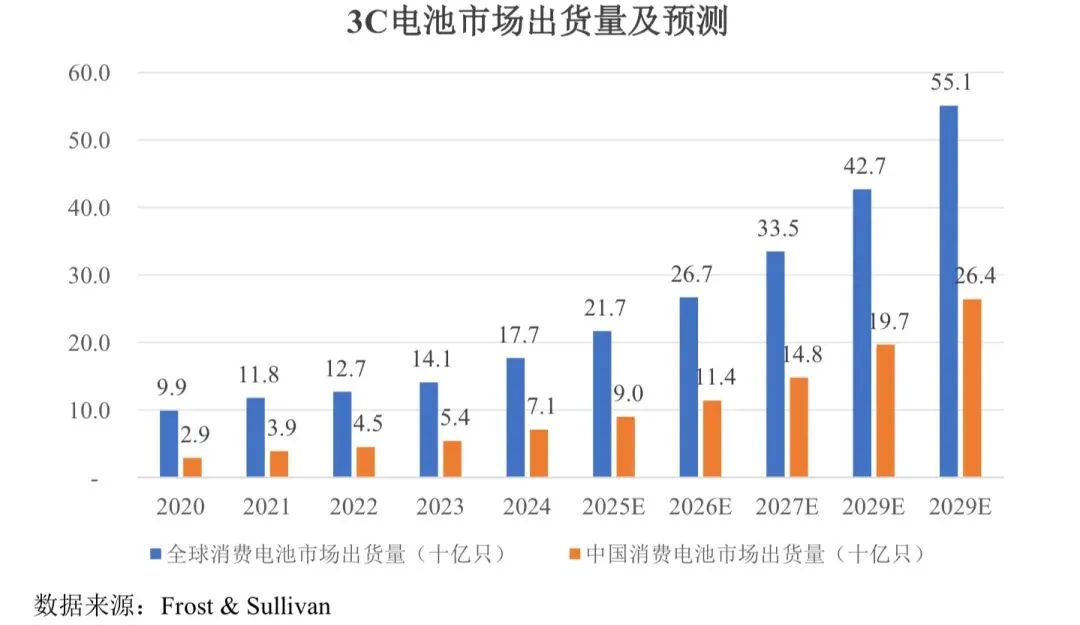 2020 年至 2024 年期间,全球 3C 电池总出货量从 99 亿只增长至 177 亿只,年复合增长率为15.9%。这一增长得益于消费电子产品、汽车电子等下游产业的扩张以及电池技术的升级。未来, 5G 设备的普及和低空经济将进一步拉动需求。预计 2025 年出货量为 217 亿只,到 2029 年将达到 551 亿只,2025-2029 年的年复合增长率达26.2%,市场将持续扩大。