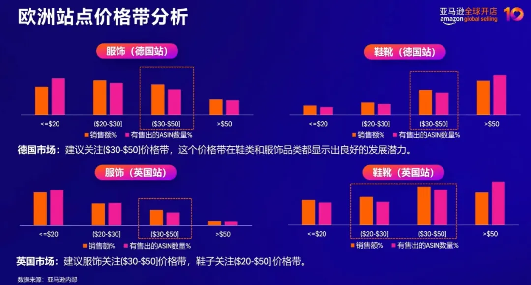 将目光转向欧洲,德国与英国作为核心市场,虽在价格带上呈现出共性——均以30至50美元的中端价位为偏好,该价格带商品的销售额占比高于数量占比,变现能力强劲——但在消费风格上却存在明显差异,这与两地的文化背景和生活习惯密切相关。