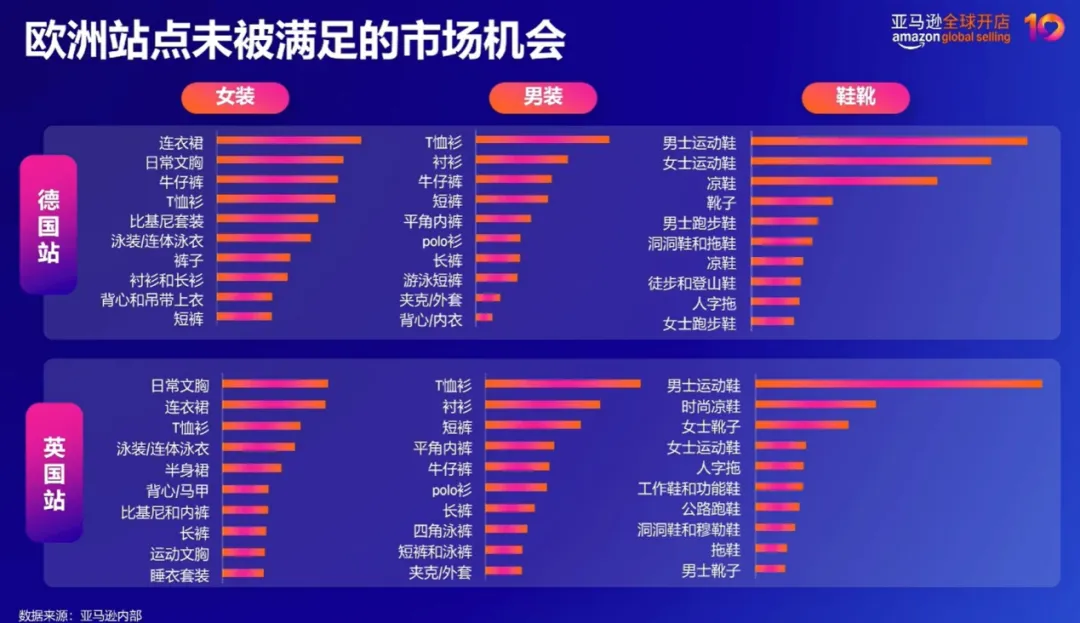 具体来看,德国消费者更注重舒适与经典,女装中复古连衣裙、高腰牛仔裤,男装中运动球衣T恤、宽松衬衫,以及鞋靴类中的防水鞋、健康鞋等实用款式更受欢迎;英国消费者则偏爱时尚与个性,紧身胸衣式连衣裙、英式刺绣T恤、音乐主题服饰,以及水钻装饰凉鞋等设计感较强的产品更能吸引目光。这种鲜明的区域差异提示卖家,在进入欧洲市场前,需深入调研目标国家的消费偏好,实施差异化的产品开发策略。