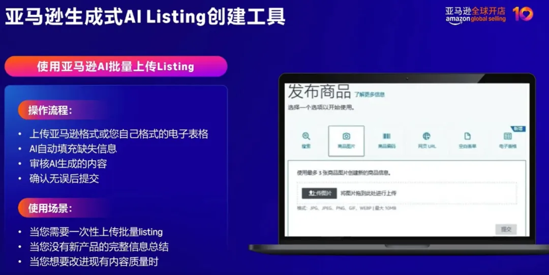 针对时尚类目SKU庞大、批量创建Listing效率低的痛点,亚马逊推出的“生成式AI Listing创建工具”有效解决了这一难题。卖家只需提供一段文字描述、一张商品图片或站外详情页,工具即可自动生成标题、五点描述、商品属性等核心内容,大幅提升上架效率,减少人工操作成本。