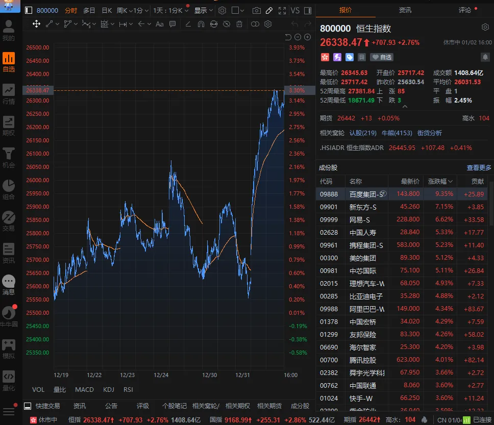 在2025年12月29日至2026年1月2日(含元旦假期)的当周,恒生指数在国内外宏观环境改善的驱动下震荡上行,全周累计上涨2.01%,恒生科技指数表现更优,大幅上涨4.31%。