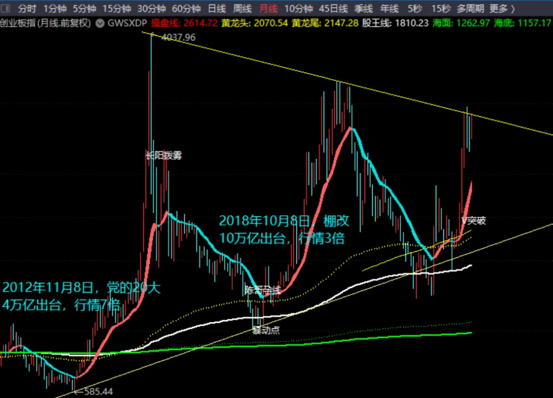 时间上,我们强调1月、4月和9月,空间上我们提醒了下方的支撑位,并且指出市场会主要会在3500-3200点震荡),在3500点附近之间受到压力,指出上方最高处的技术压力位应当是3950点附近,认为市场很难突破3950点附近的这个技术位。事实上,全年市场中确实也是双创表现十分抢眼,科技股强势如虹,并且上证在3950点附近震荡异常激烈。12月的K线继续收在此趋势线上方,所以客观地讲从目前的月K线图上看,后市对多头有利。