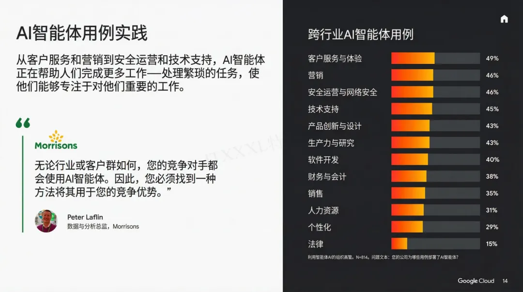 这里的早期采用者是指AI预算50%以上投智能体,且深度嵌入日常运营流程。生产力、客户体验、业务增长、营销、安全,这五个方向的共同点是:高频、流程化、可量化、能快速上线,容易在3到6个月做出看得见的改进。值得mark一下,甲方关注的点,对乙方来说就是商机