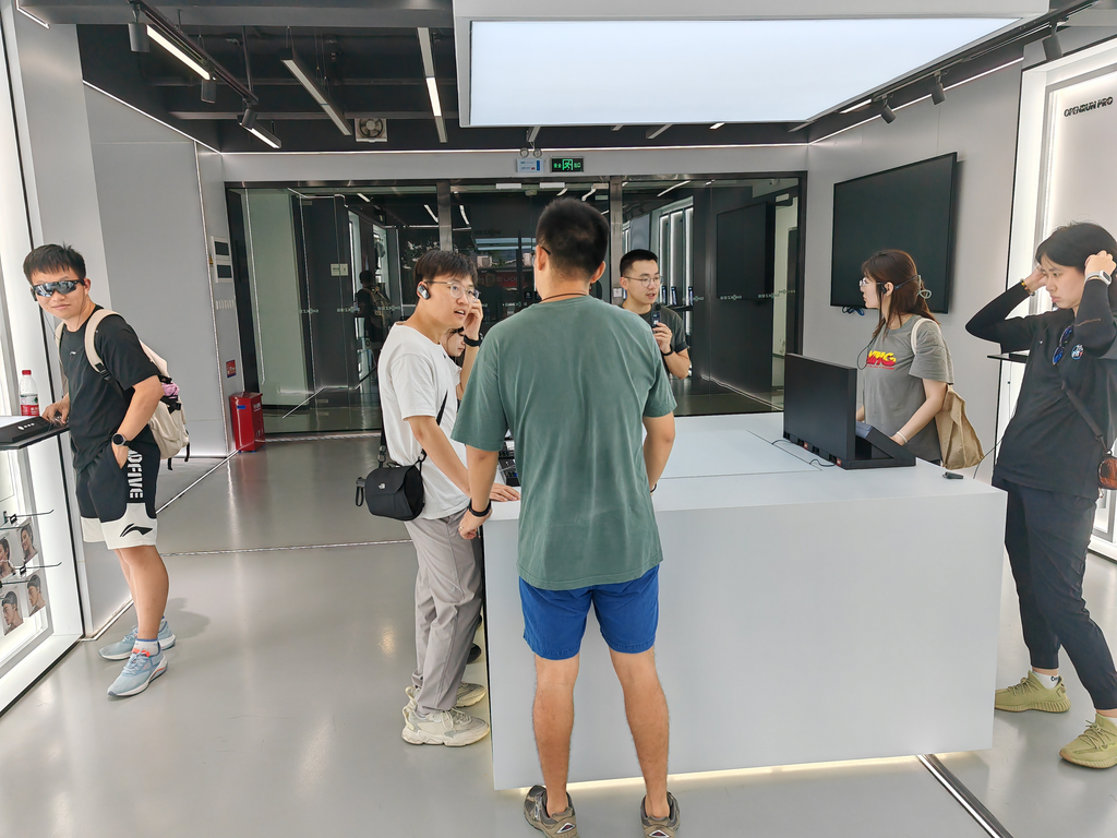 之后,支队成员们来到韶音公司的产品体验室,亲身感受了公司最新推出的骨传导耳机和运动耳机产品。其佩戴的舒适度和通透的音质给大家留下了深刻的印象。