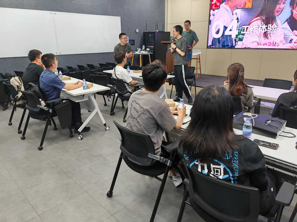 最后,支队成员和韶音公司的工作人员一同来到会议室进行交流,到场的还有韶音公司研发部门的负责人,也是清华硕士毕业的校友。