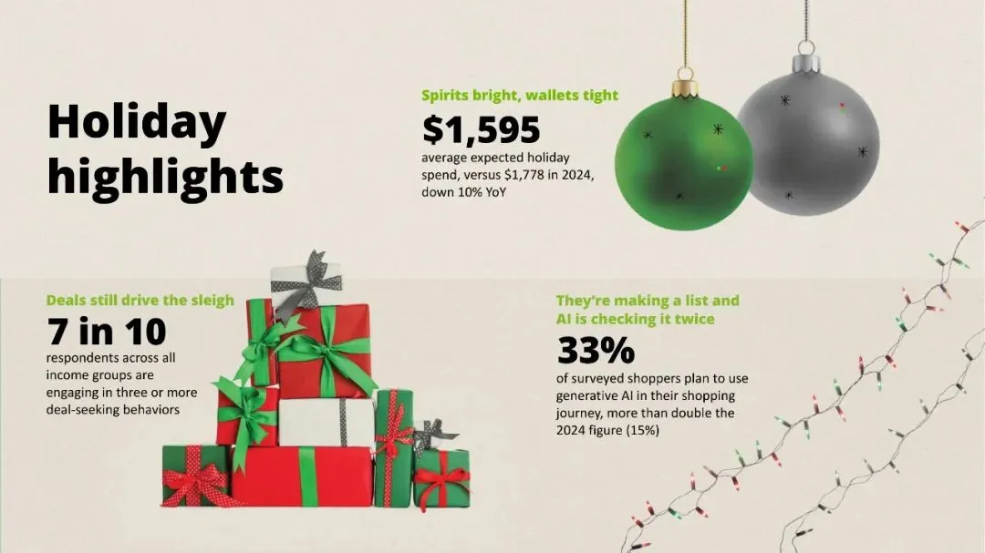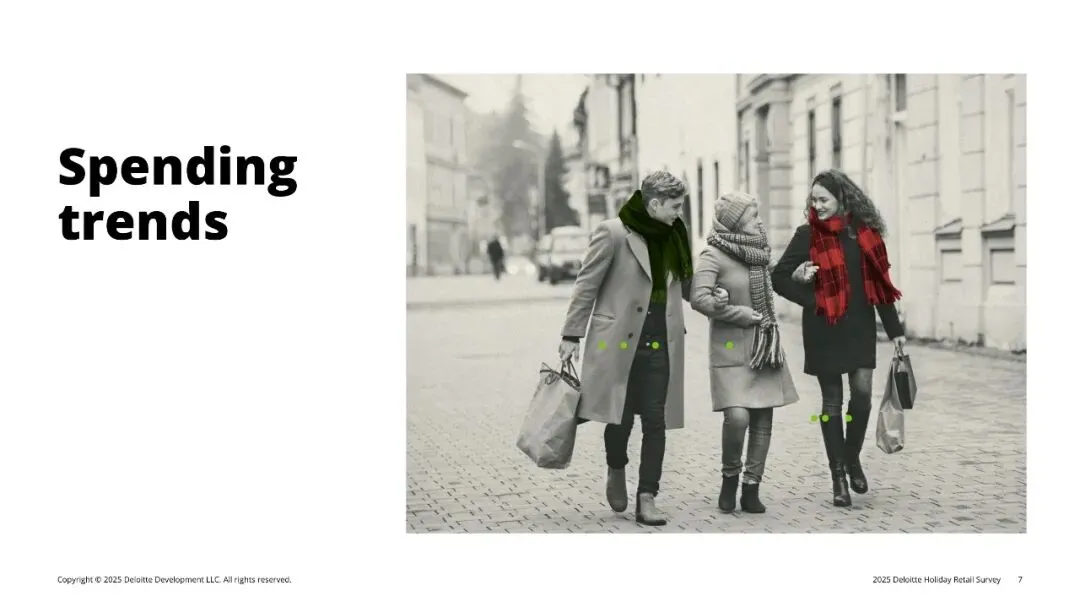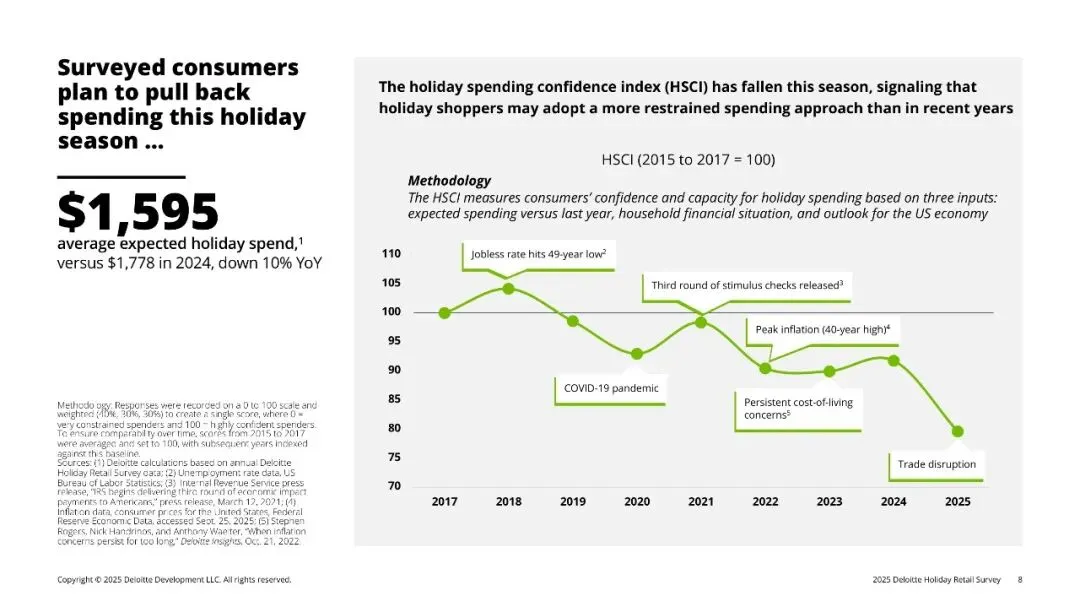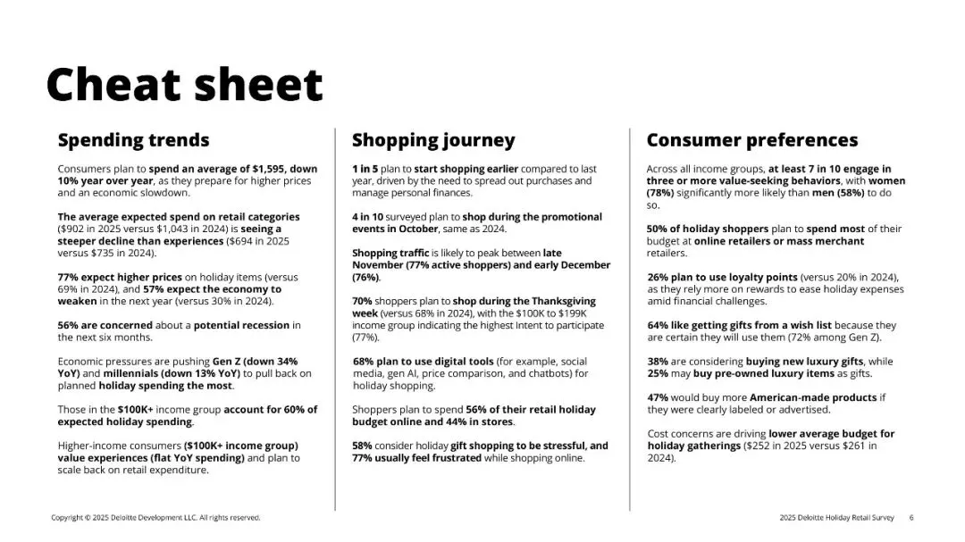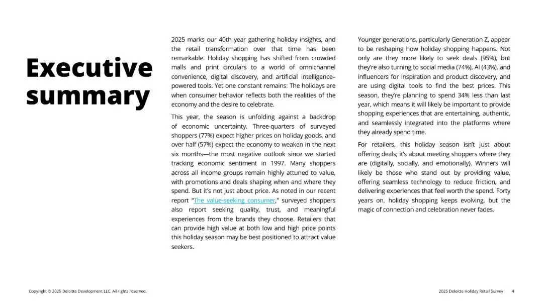 德勤第40份年度假日零售调查基于4,270名美国消费者样本,显示2025年假季总预算降至人均1,595美元(-10% YoY),创2008以来最大降幅。77%预计节日商品涨价,57%看衰2026年经济,为1997年追踪以来最悲观。消费者在“想庆祝”与“钱包紧”之间寻找平衡:促销仍是第一触发点,但品质、体验与情绪价值成为差异化关键;线上、AI、社媒加速渗透,Gen Z人均支出骤降34%,却带动33%受访者计划使用生成式AI购物,比例较去年翻番。零售商唯有在“全渠道低价+低摩擦体验+情感共鸣”三点同时得分,方能撬动有限预算。