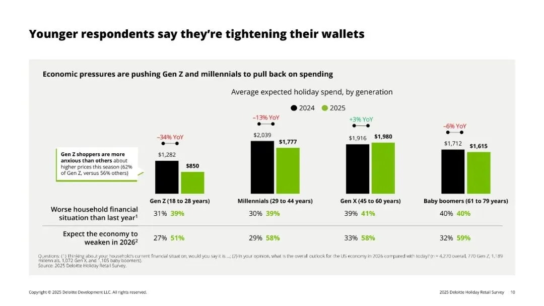 - Gen Z人均预算仅850美元(-34%),Millennials -13%;Boomers逆势+3%。