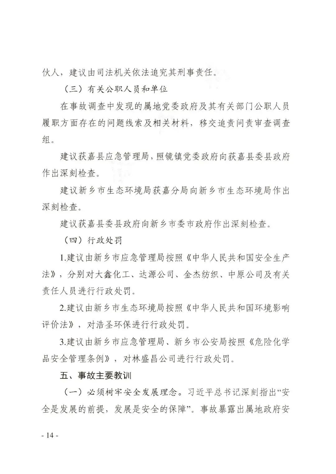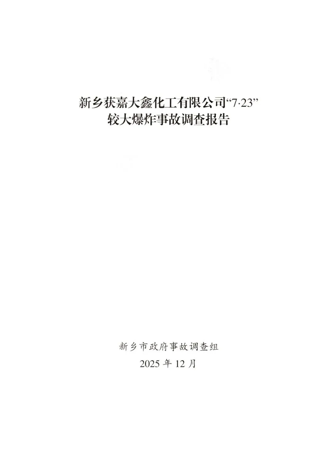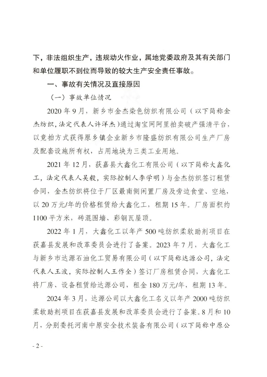 调查认定,新乡获嘉大鑫化工有限公司“7·23”较大爆炸事故是一起因企业非法转租厂房设备,在不具备安全生产条件的情况下,非法组织生产,违规动火作业,属地党委政府及其有关部门和单位履职不到位而导致的较大生产安全责任事故。