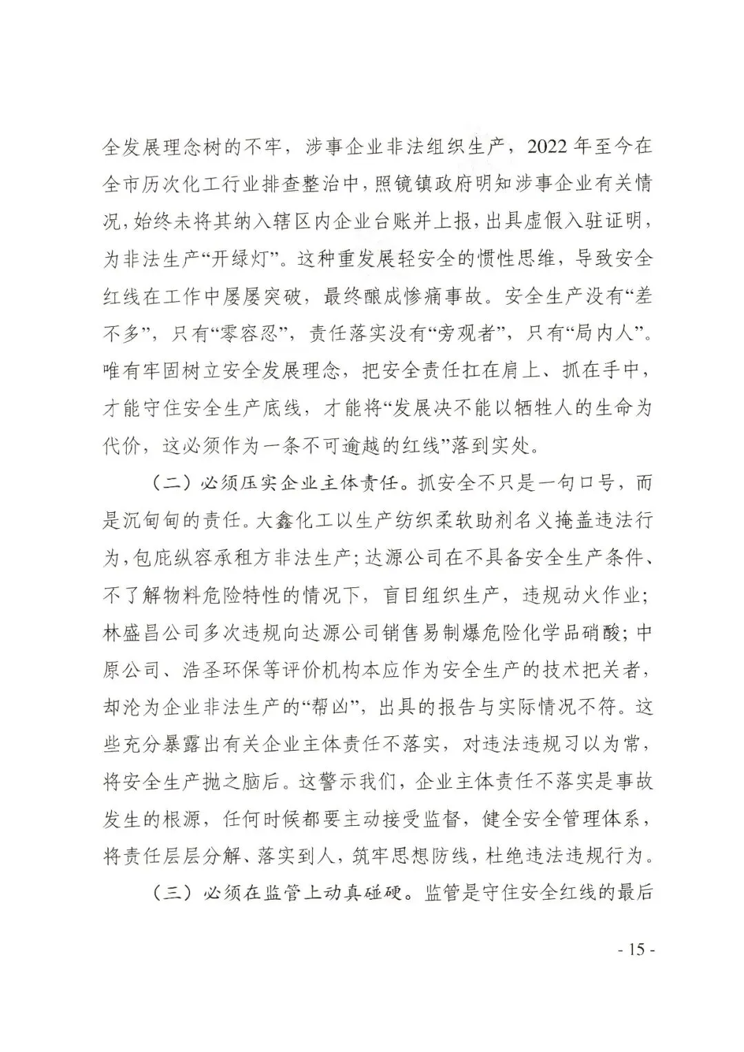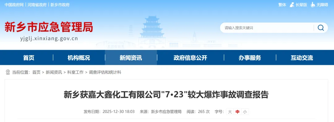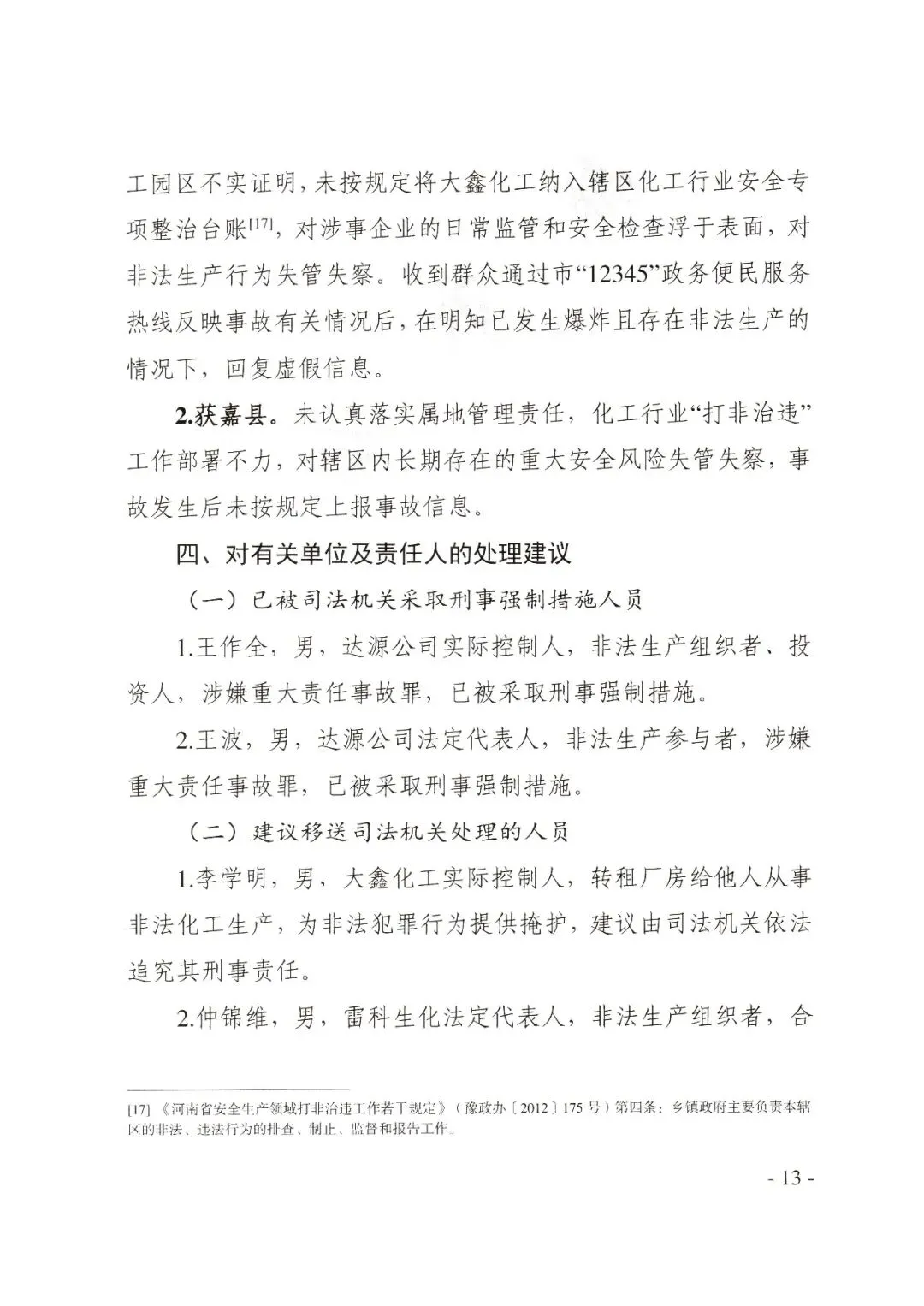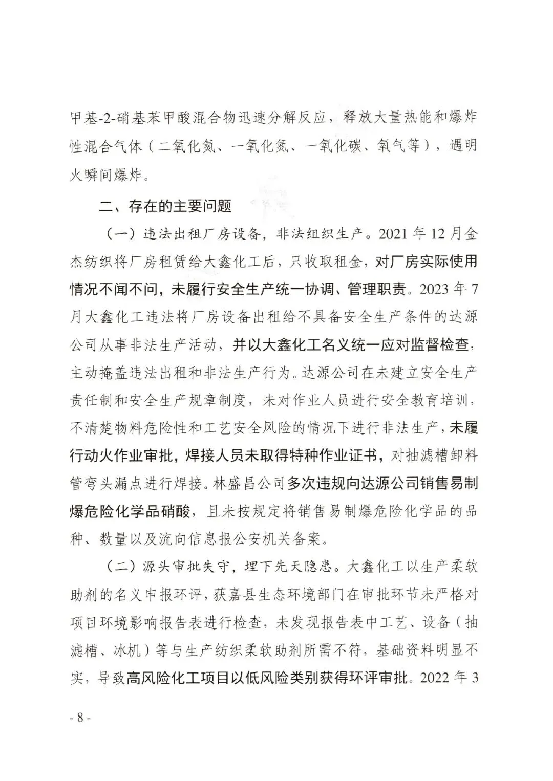 调查认定,新乡获嘉大鑫化工有限公司“7·23”较大爆炸事故是一起因企业非法转租厂房设备,在不具备安全生产条件的情况下,非法组织生产,违规动火作业,属地党委政府及其有关部门和单位履职不到位而导致的较大生产安全责任事故。