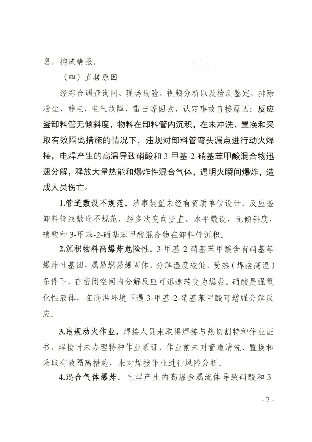 二:直接原因 反应釜卸料管无倾斜度,物料在卸料管内沉积,在未冲洗、置换和采取有效隔离措施的情况下,违规对卸料管弯头漏点进行动火焊接,电焊产生的高温导致硝酸和3-甲基-2-硝基苯甲酸混合物迅速分解,释放大量热能和爆炸性混合气体,遇明火瞬间爆炸,造成人员伤亡。