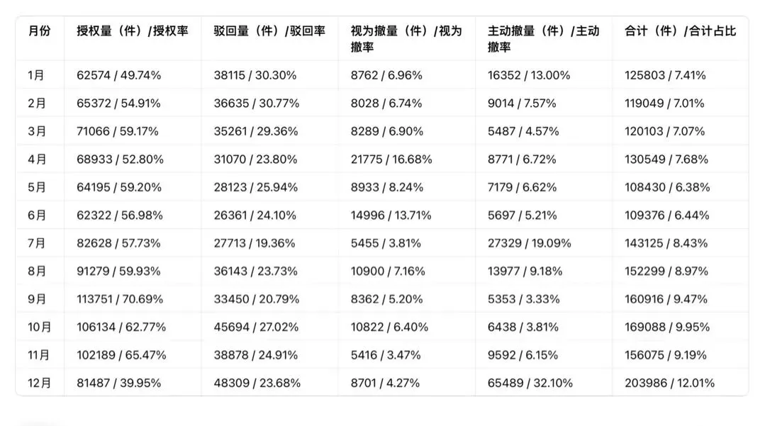 • 驳回率同步走低:与授权率攀升相对应的是,驳回率整体呈下降趋势,从1月的30.30%逐步回落,7月降至全年最低点19.36%,年末12月回升至23.68%,全年多数月份驳回率控制在25%以内。