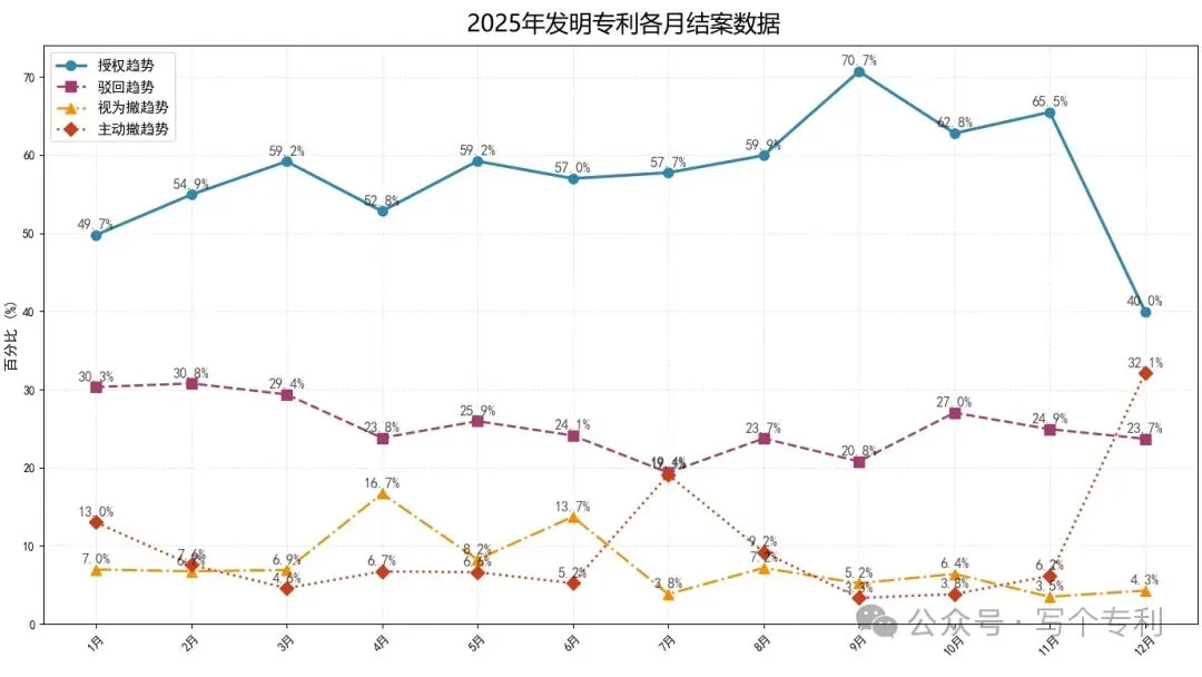 • 主动撤回率:波动幅度极大,成为影响月度数据结构的关键因素。全年多数月份主动撤回率在3%-10%区间,但7月和12月异军突起,分别达到19.09%和32.10%,这两个月份的异常数据,也侧面反映出不同阶段创新主体的专利申请策略调整。