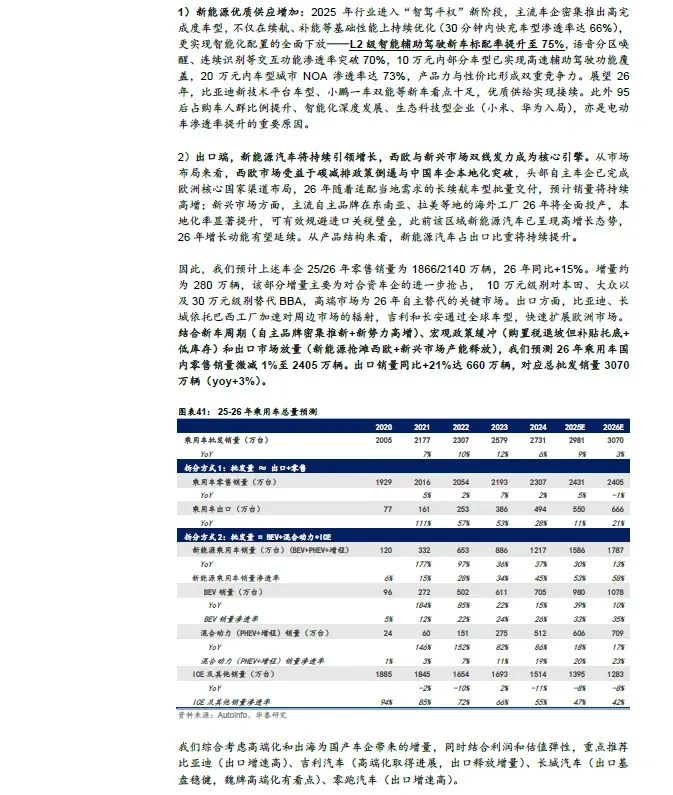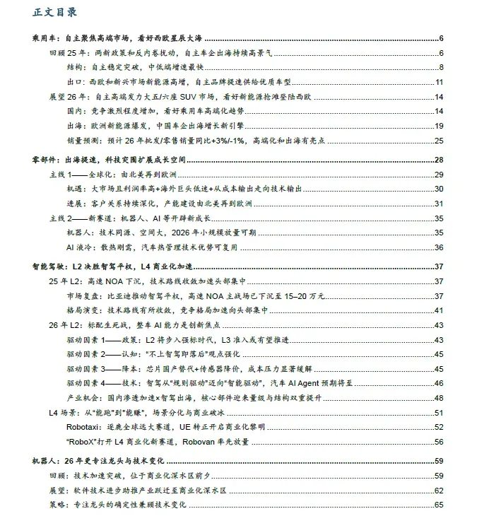 ①乘用车:总量平淡,自主高端发力大五/六座SUV 市场,新能源抢滩登陆西欧,推荐高端化和出口有看点的比亚迪/吉利/长城/零跑等。②零部件把握“全球化+新赛道”两条主线:全球化更侧重欧洲新机会,围绕订单与产能进行投资布局;新赛道重点关注机器人和AI 液冷,机器人26 年把握去伪存真与技术变量,液冷与汽车底层技术高度相通,新赛道带来业绩成长性与估值弹性。③智能驾驶:将是AI 应用重要方向,技术端整车AI 化加速,城市NOA 加速由20 万向15 万价格标配化,L4 也将迎来更大规模商业落地,推荐核心运营平台以及高成长性零部件供应商。
