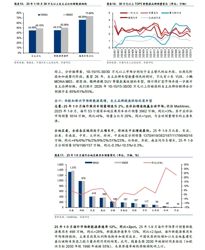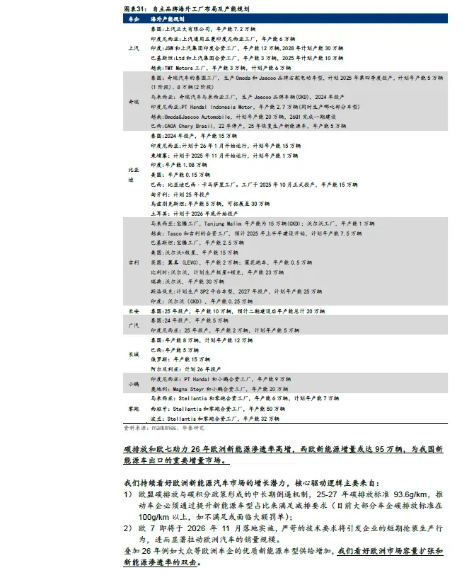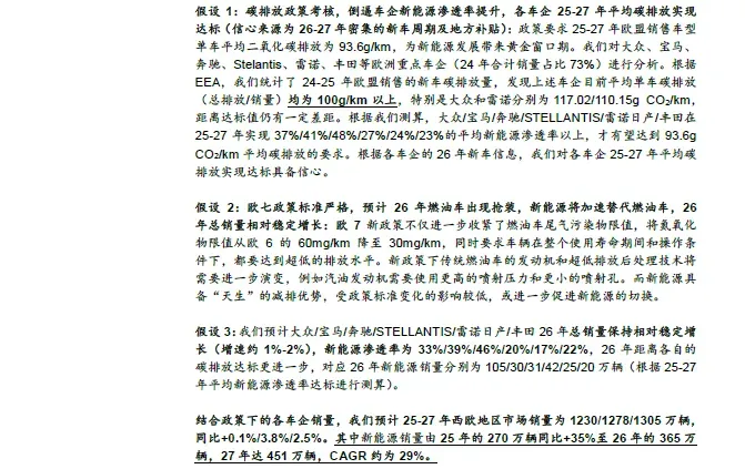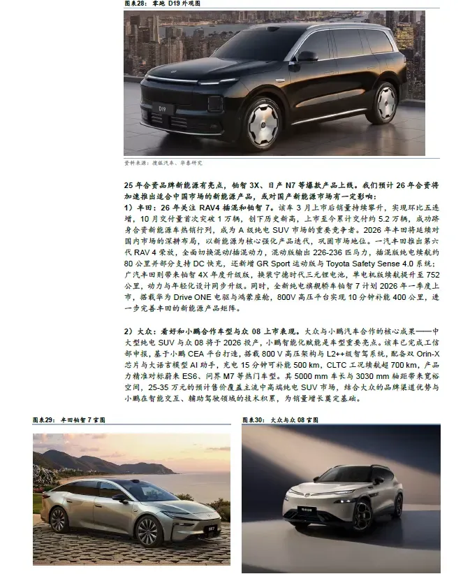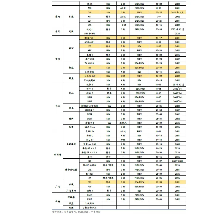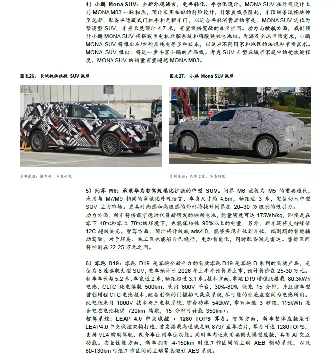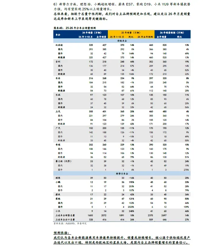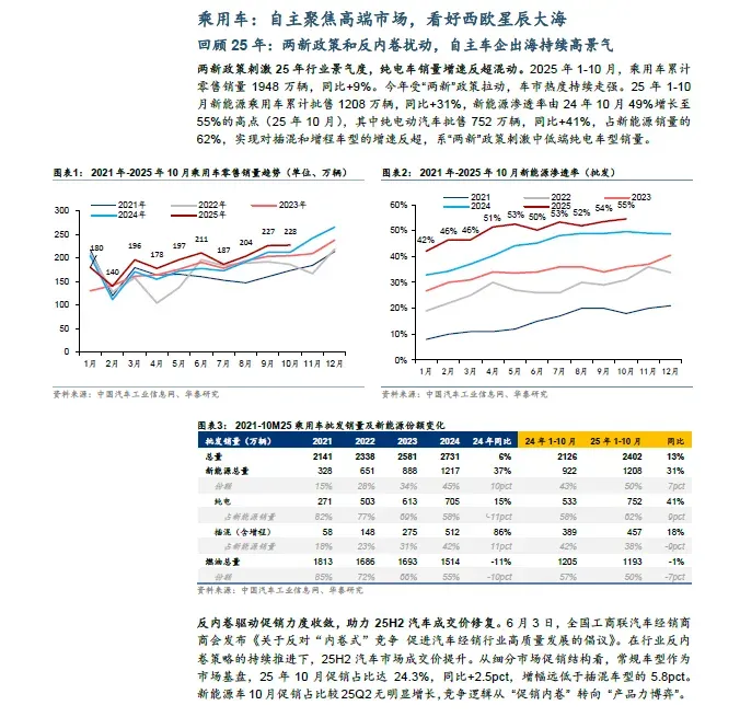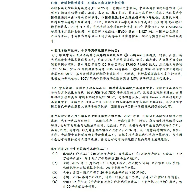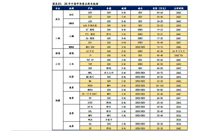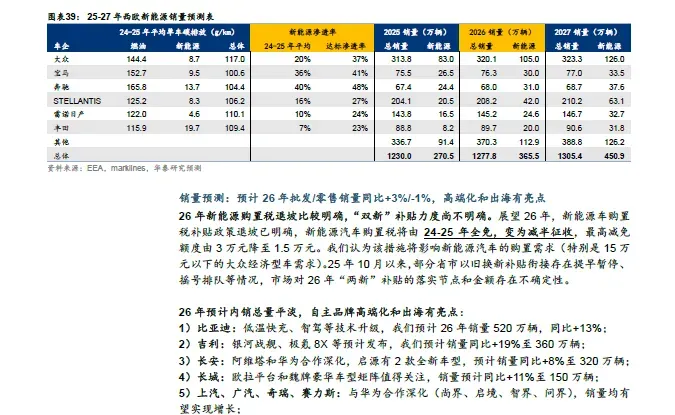 25 年两新政策刺激行业景气度,反内卷驱动促销力度收敛,25 年1-10 月自主份额由去年同期60%提至66%,其中中低端增速最快。展望26 年,我们预计乘用车批发/零售销量同比+3%/-1%,总量平淡。国内方面,我们汇总100+个26 年新车,预计国内车企竞争更激烈,结构上,自主高端发力大五/六座SUV 市场,关注小米YU9、蔚来ES7、极氪8X、启境F05、问界M9L、零跑D19、魏牌DE 系列等重磅车型。出海方面,我们看好欧洲新能源市场高增,预计26 年欧洲新能源销量为365 万辆(yoy+35%),驱动力为碳排放法规及优质新车供给,此外我们看好新兴市场自主本地产能放量。