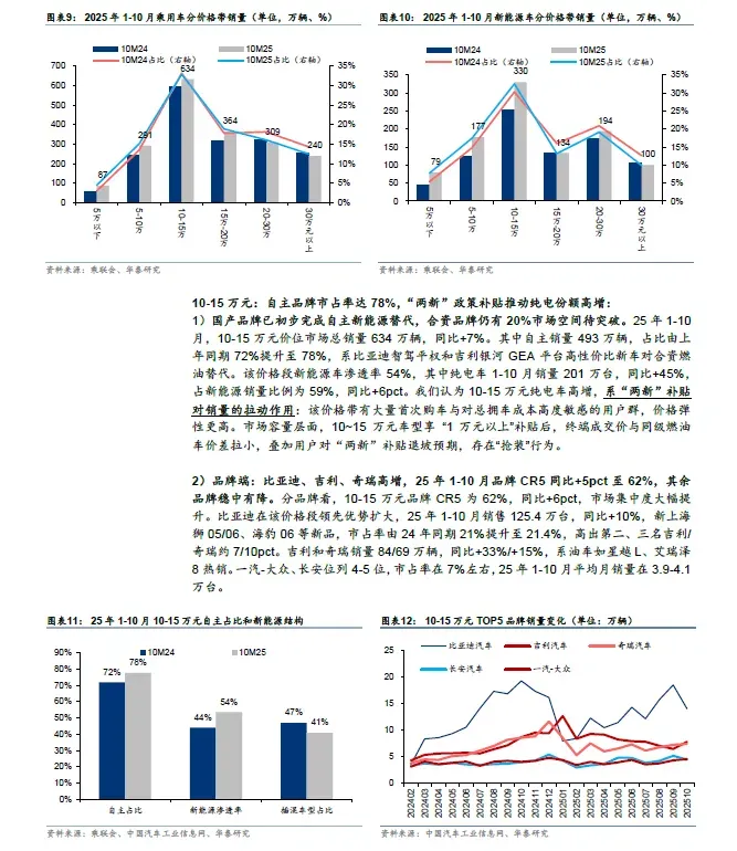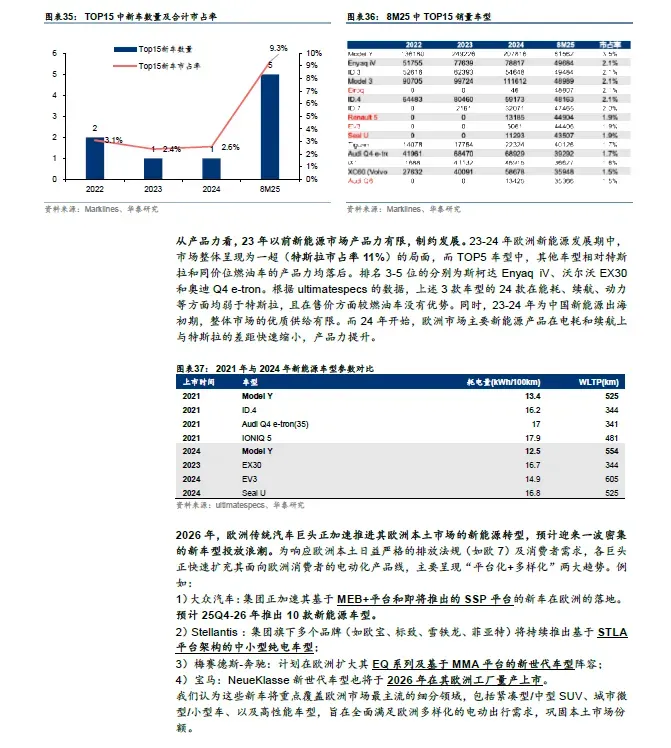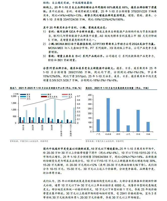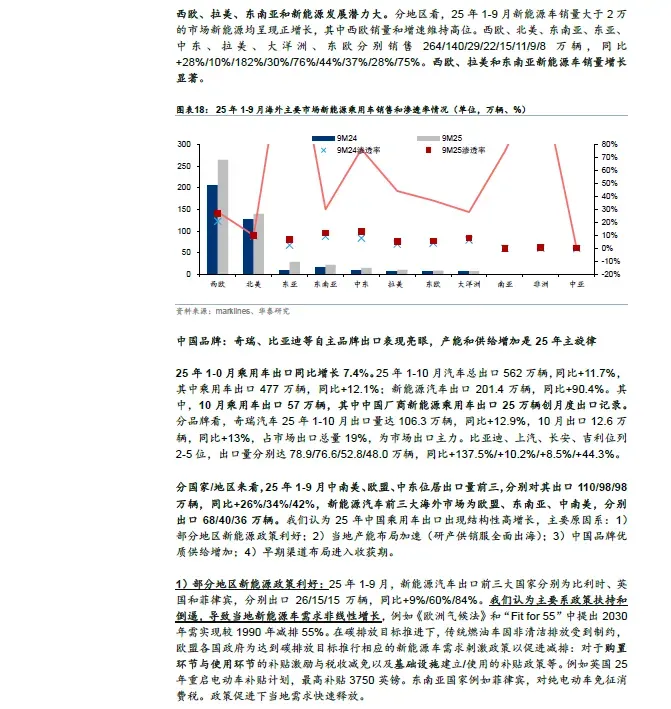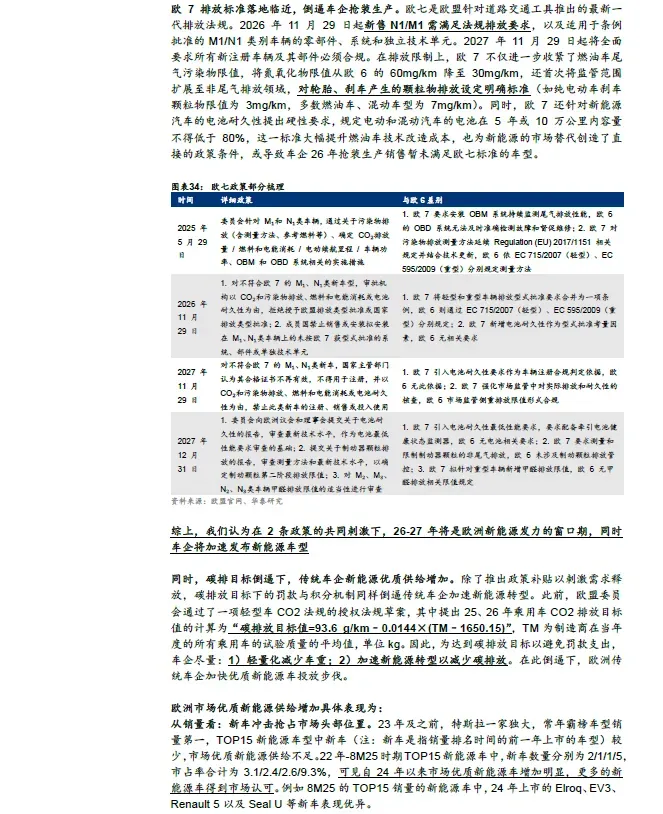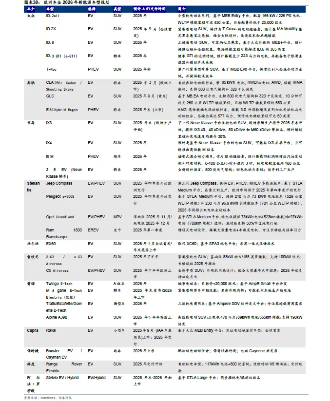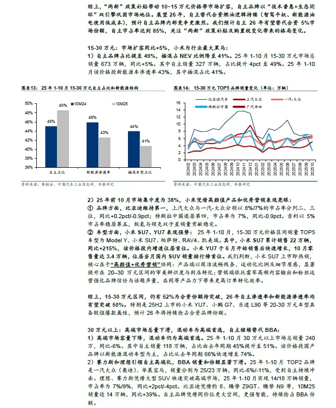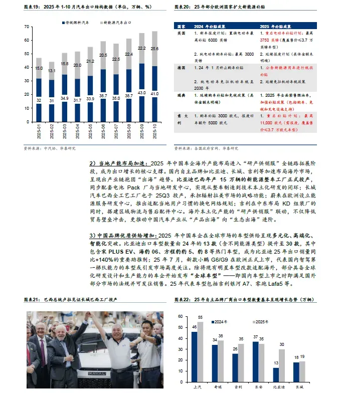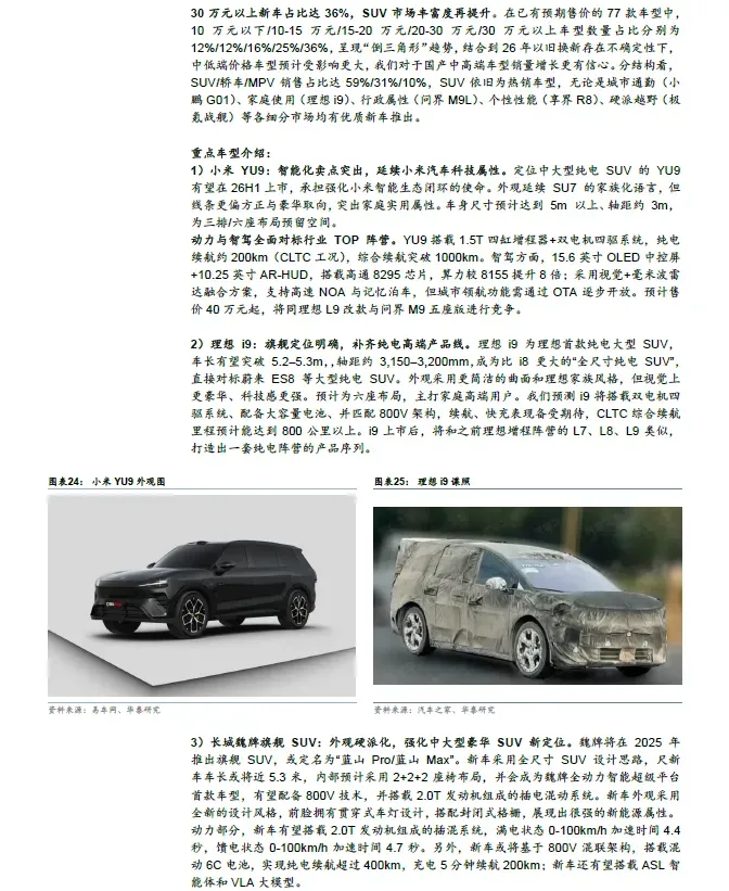 25 年两新政策刺激行业景气度,反内卷驱动促销力度收敛,25 年1-10 月自主份额由去年同期60%提至66%,其中中低端增速最快。展望26 年,我们预计乘用车批发/零售销量同比+3%/-1%,总量平淡。国内方面,我们汇总100+个26 年新车,预计国内车企竞争更激烈,结构上,自主高端发力大五/六座SUV 市场,关注小米YU9、蔚来ES7、极氪8X、启境F05、问界M9L、零跑D19、魏牌DE 系列等重磅车型。出海方面,我们看好欧洲新能源市场高增,预计26 年欧洲新能源销量为365 万辆(yoy+35%),驱动力为碳排放法规及优质新车供给,此外我们看好新兴市场自主本地产能放量。