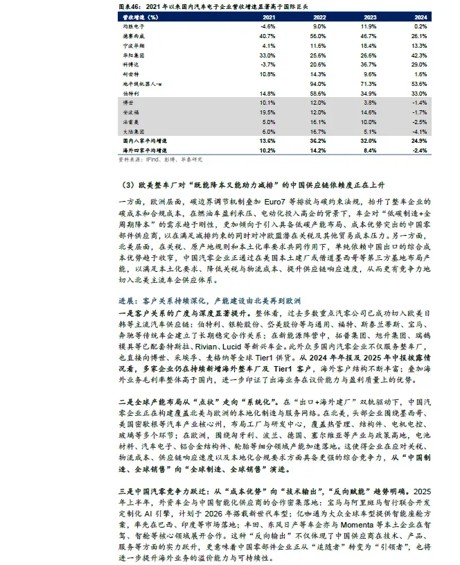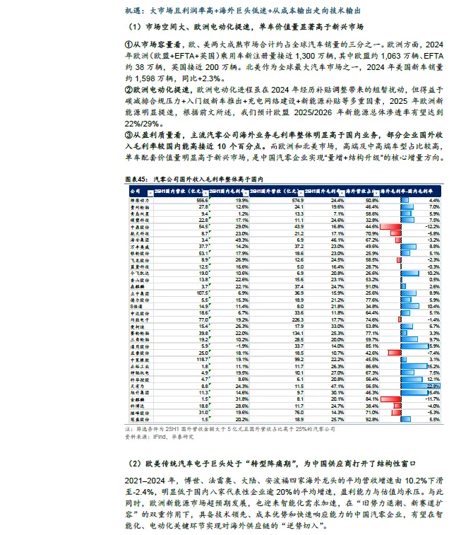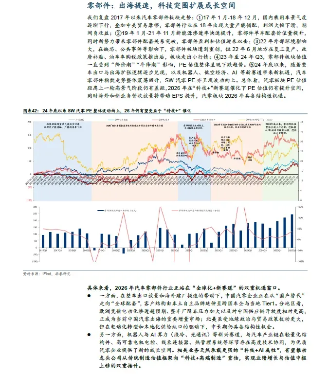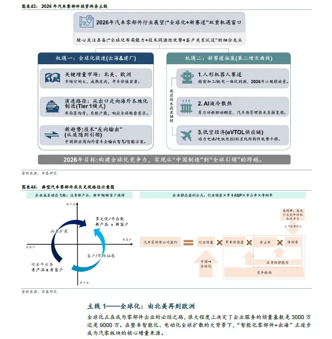 汽零板块26 年重点关注全球化+新赛道。出海方面,欧美市场空间大ASP高+欧洲电动化提速+传统国际巨头处于转型阵痛期+海外主机厂降本需求,汽零出海迎来结构性机遇,特别关注细分赛道龙头。AI 革新汽零新成长,汽零企业在技术同源/客户资源导入/制造等优势明显,进攻新领域驱动板块由传统制造向“科技+高端制造”重塑,有望带来业绩与估值双重抬升。推荐敏实/星宇/爱柯迪/福耀/继峰/三花智控/拓普/银轮/华阳/新泉/岱美等。