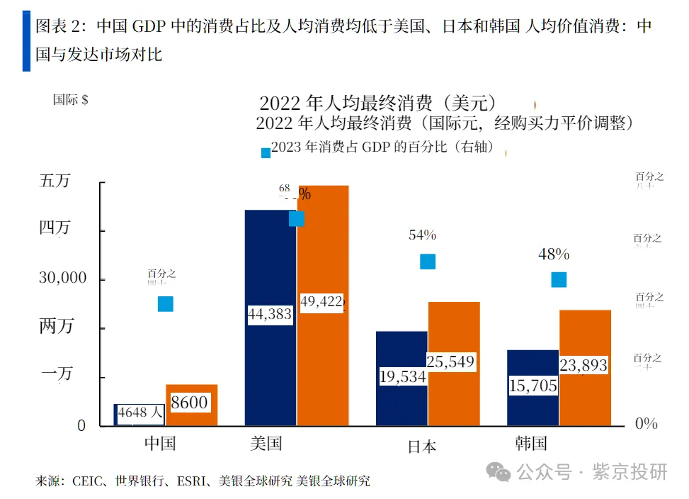统计口径存在偏差:中国居民消费占 GDP 比重约 40%,看似低于美国(68%)、日本(54%),但若加入政府提供的社会转移支付(如社保、公共服务),这一比例将提升 7 个百分点,与韩国基本持平,差距大幅缩小。