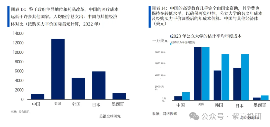 住房:2021 年中国人均住房建筑面积达 49 平方米,超过英国、法国,仅低于美国的 65 平方米,满足基本居住需求的能力已达发达国家水平。 医疗:人均门诊次数 6.8 次 / 年,超过美国(3.4 次)和 OECD 均值(6.0 次);每千人医院床位 5.0 张,远超美国(2.7 张),医疗资源可及性并不逊色。 教育:预期受教育年限达 15.5 年,与美、日持平,课后辅导参与率即便在 “双减” 后仍远高于西方,教育消费需求旺盛。