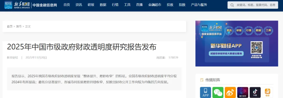 新华财经北京11月20日电(记者董道勇)20日,由清华大学21世纪发展研究院与四川大学公共管理学院联合课题组编制的《2025年中国市级政府财政透明度研究报告》正式发布。课题组通过网上采集全国296个地级及地级以上市政府公布的一百多项财政透明度相关指标,分析和研究我国市政府财政公开情况。