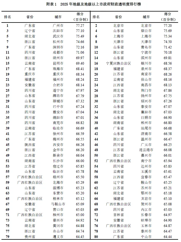 报告显示,2025年我国市级政府财政透明度呈现“整体提升、差距收窄”的特征。全国市级政府财政透明度平均分较2024年有所提高;最低分显著提升,各城市间发展差距持续收窄,反映出财政公开工作向较为均衡的方向发展。具体城市方面,广州市、北京市、沈阳市、烟台市、武汉市、上海市、杭州市、天津市、深圳市、青岛市依次排列,位居前十。