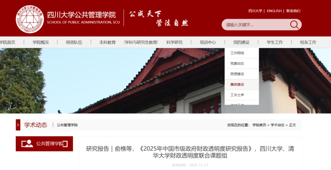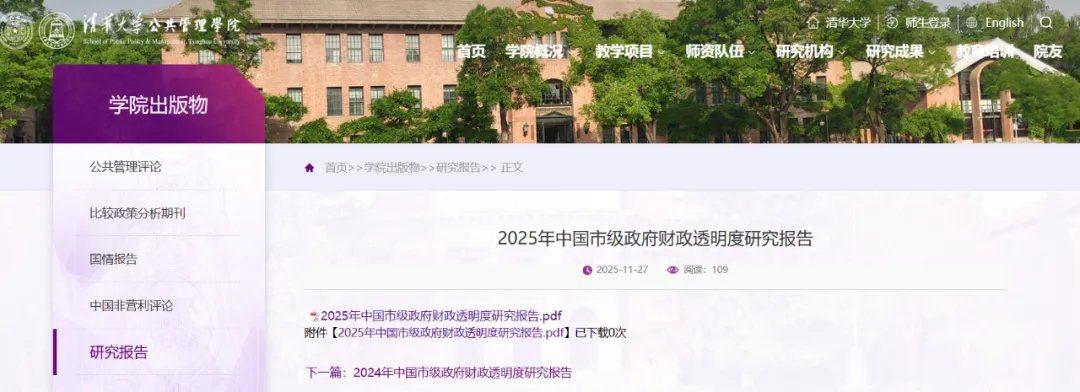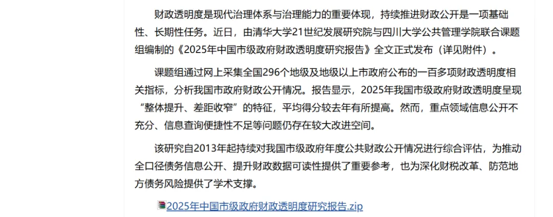 《2025年中国市级政府财政透明度研究报告》将在清华大学公共管理学院和四川大学公共管理学院的网站上同时登出。