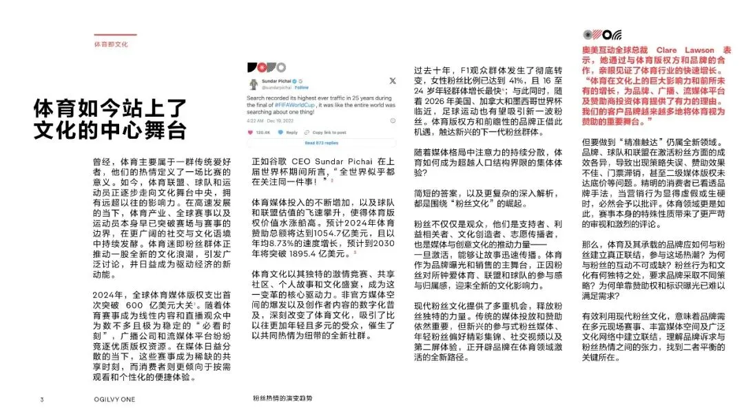 奥美Ogilvy基于全球粉丝调研与一线案例,指出体育已升级为跨文化现象:2024年全球体育媒体版权支出首破600亿美元,体育赞助总额预计1054.7亿美元、年复合增速8.73%,2030年将达1895.4亿美元。然而,粉丝身份从“观众”跃升为“创意经济引擎”,其情感投入无法直接量化却决定商业成败。报告提出“体育即文化、粉丝即创意经济、互联时代需让渡部分控制权”三大核心结论,并给出可落地的参与式营销框架。