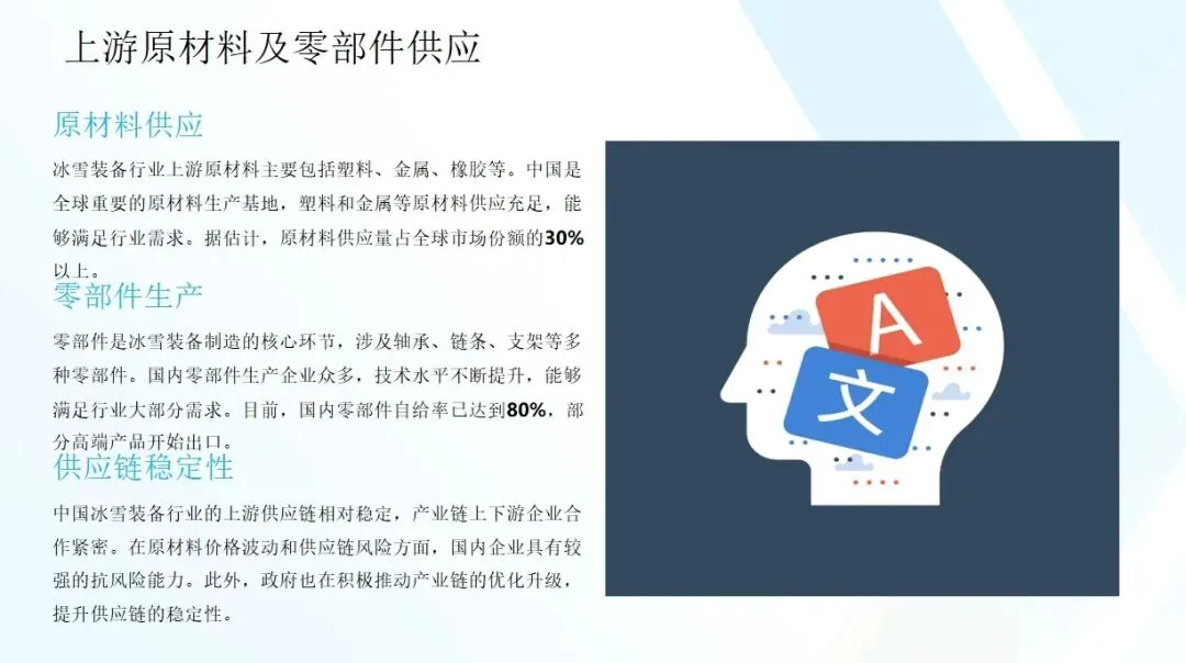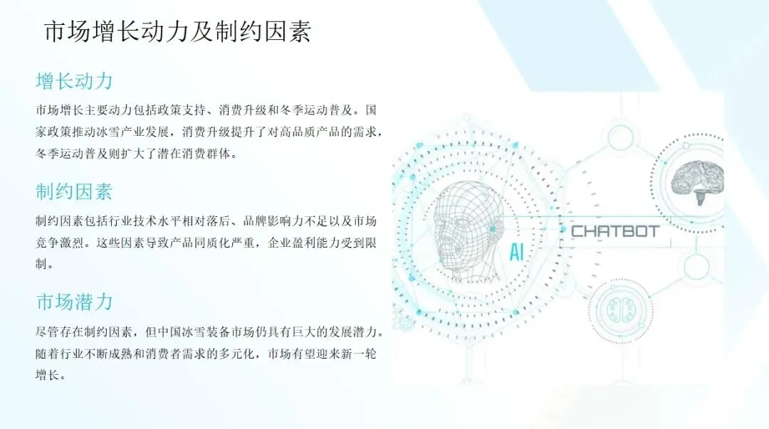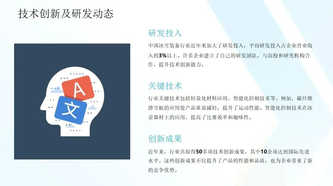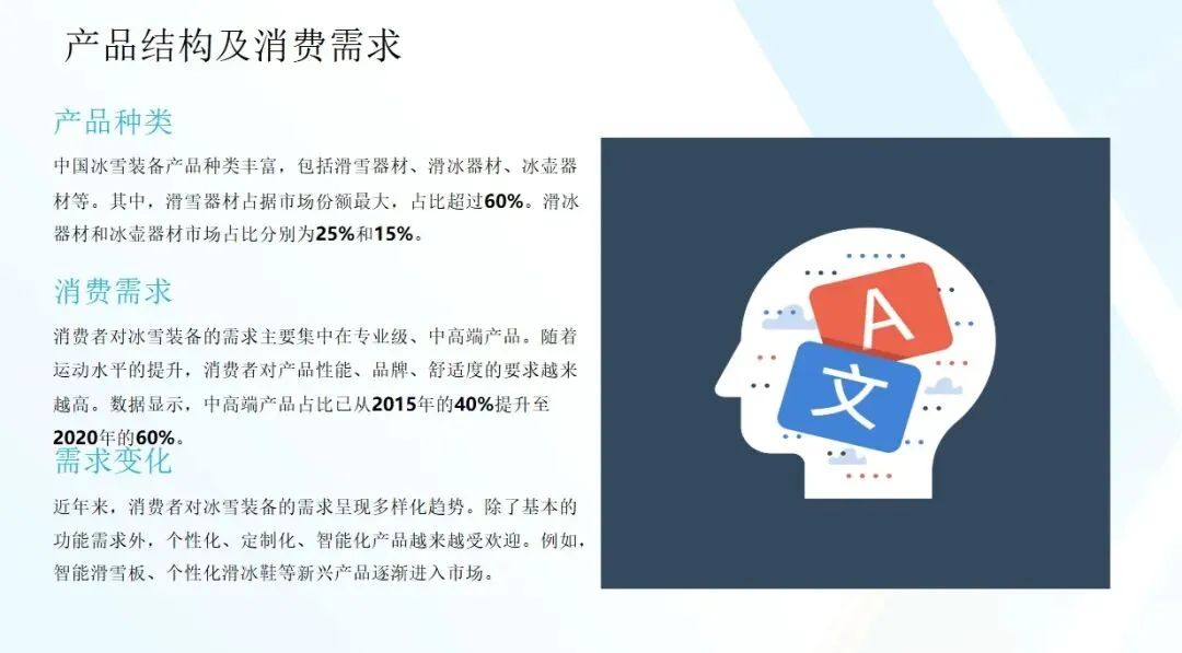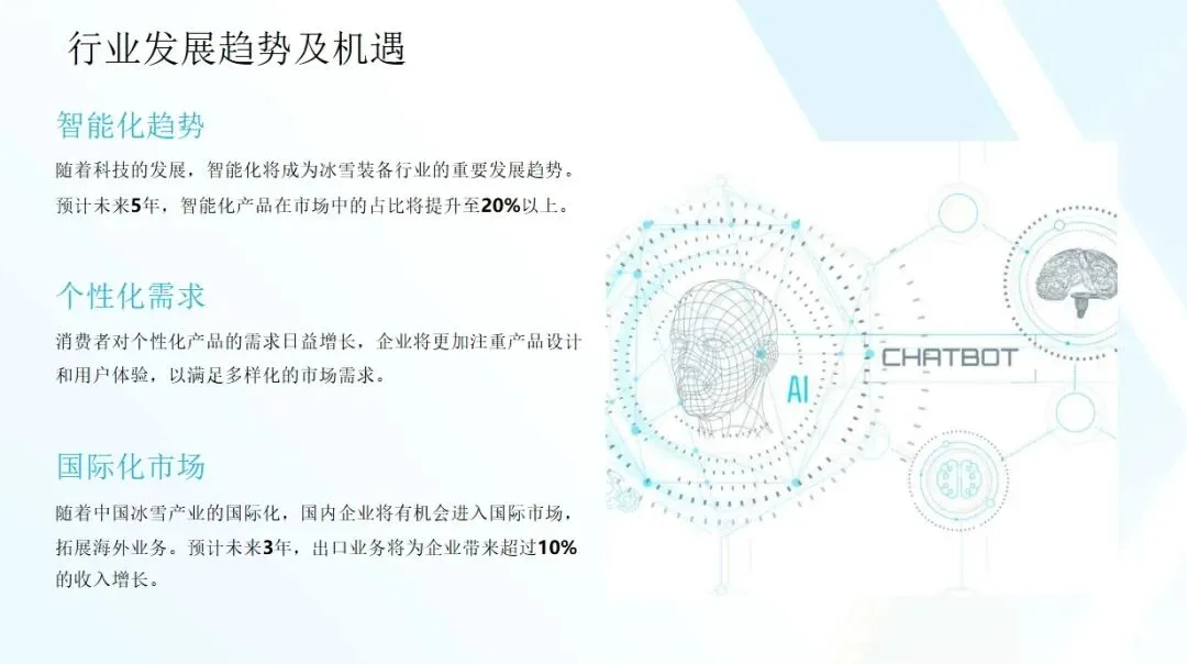随着新材料、新技术的应用,冰雪装备的性能将得到进一步提升,智能化、个性化产品将成为市场趋势