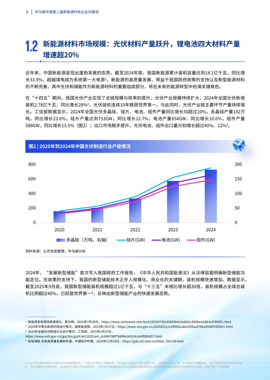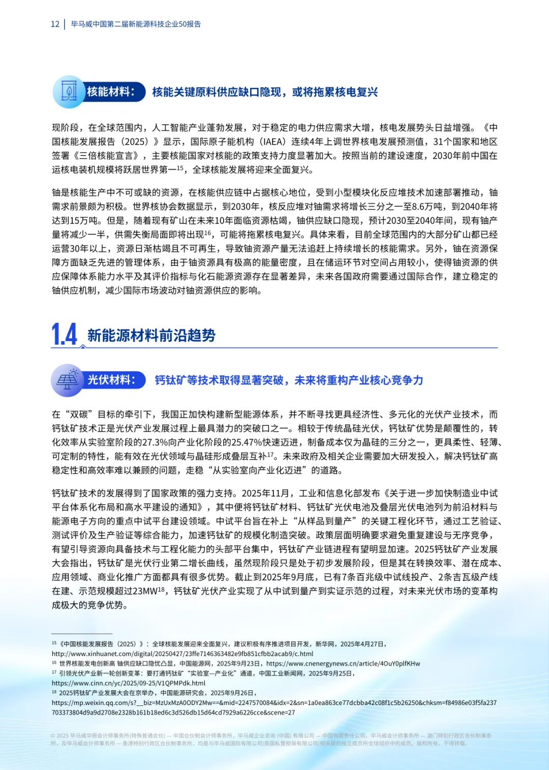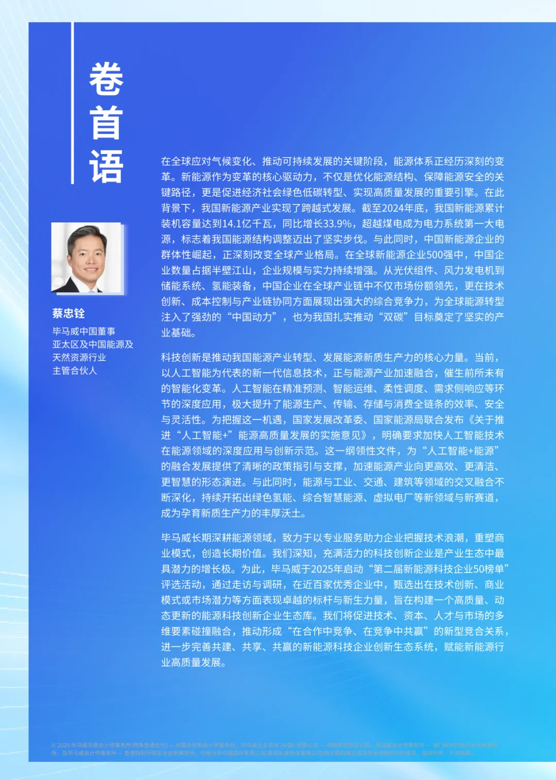 报告聚焦新能源科技产业发展态势,评选出 50 家标杆企业,覆盖循环经济、新能源材料、可持续燃料三大核心赛道,为行业发展提供参考。我国新能源产业已实现跨越式发展,2024 年底累计装机容量达 14.1 亿千瓦,超越煤电成为第一大电源。50 家上榜企业呈现显著产业集聚特征,粤苏京沪四地占比达 70%,长三角城市群领跑。企业技术导向鲜明,六成企业技术人员占比超 40%,核心技术集中在钙钛矿光伏、钠离子电池、氢能储运等前沿领域,多项成果实现国产替代与商业化落地。报告显示,产业正朝着技术多元化、应用场景化、生态协同化方向演进。政策支持与市场需求双轮驱动下,新能源材料、可持续燃料等赛道增长潜力显著,但仍面临核心材料依赖、成本控制等挑战。上榜企业的技术创新与商业模式探索,为行业高质量发展注入强劲动力。