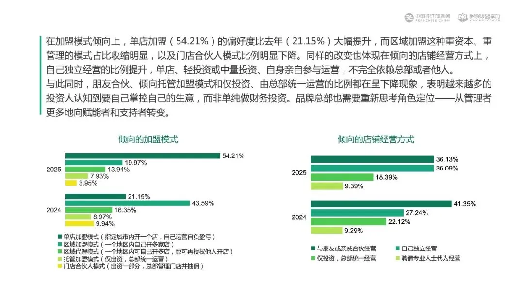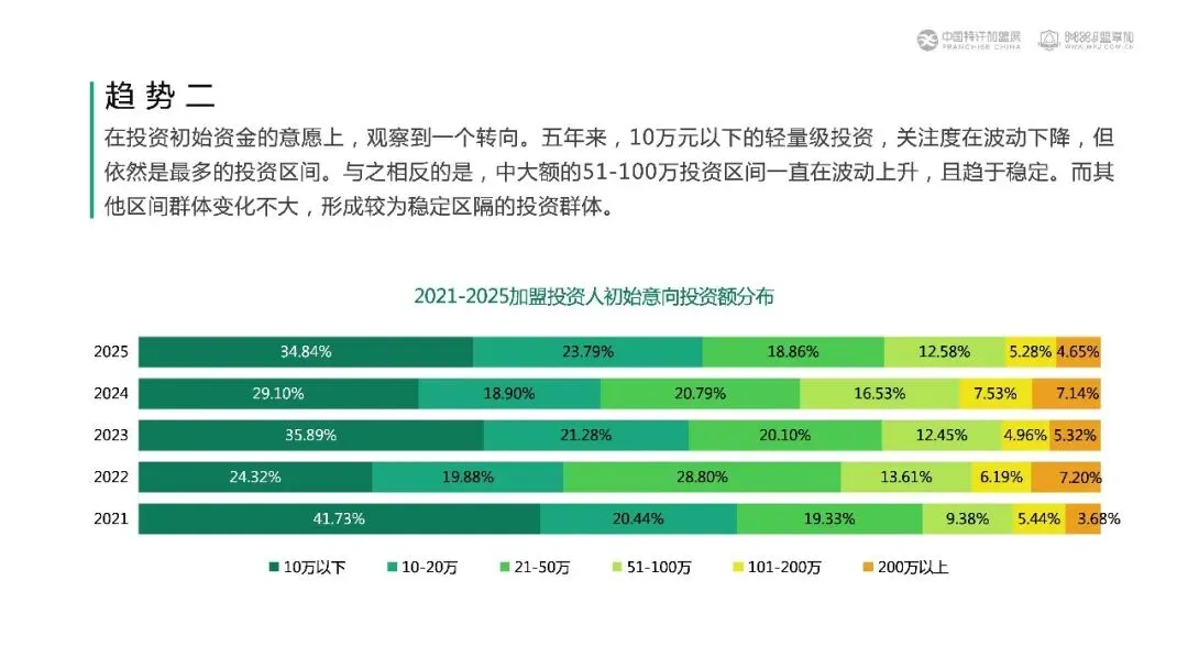 00后用9.48%的占比撬开加盟大门,却用“10万以下+单店自营”把特许连锁逼回轻资产擂台。报告显示:00后投资人群五年膨胀5倍,39.4%来自一线城市;10万以下轻投占比虽降至34.8%,仍居主流;51-100万区间企稳18.9%,单店加盟偏好一年飙升33个百分点至54.2%。