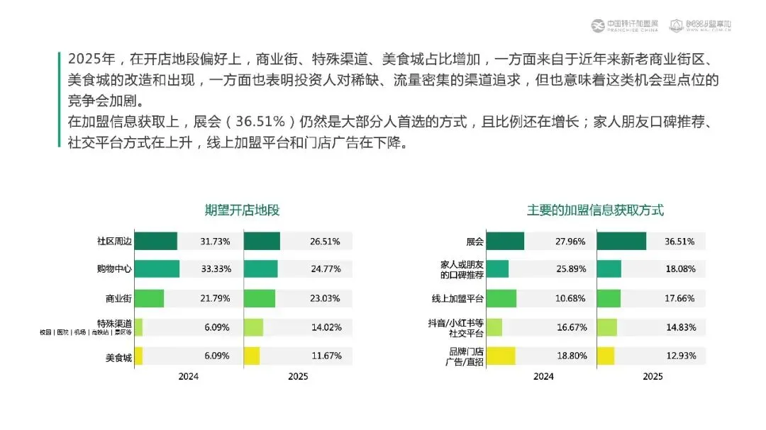 年轻增量资金风险胃纳极低,把加盟当成“可控副业”,倒逼品牌砍掉重资产区域代理,转推10㎡饮品站、AI无人货柜等“轻量化模型”;同时他们信息源38%来自展会,36%来自抖音小红书,流量漏斗前移,总部必须“线上种草+线下快闪”双轮驱动,否则连样板店都租不到好口子。