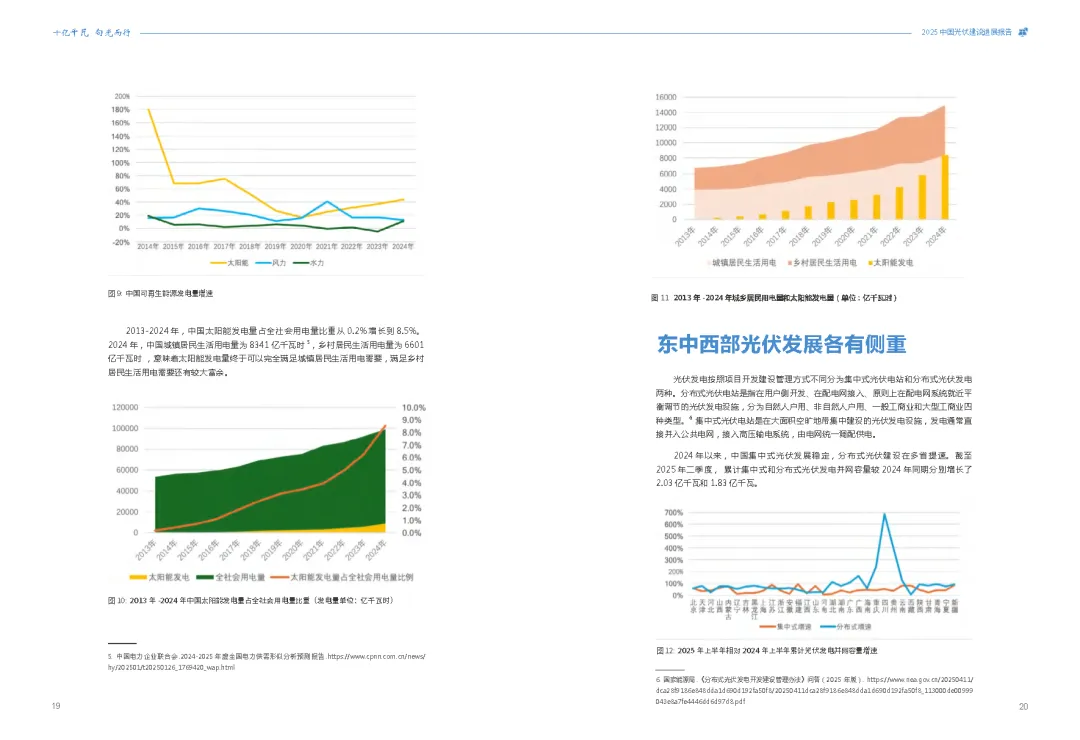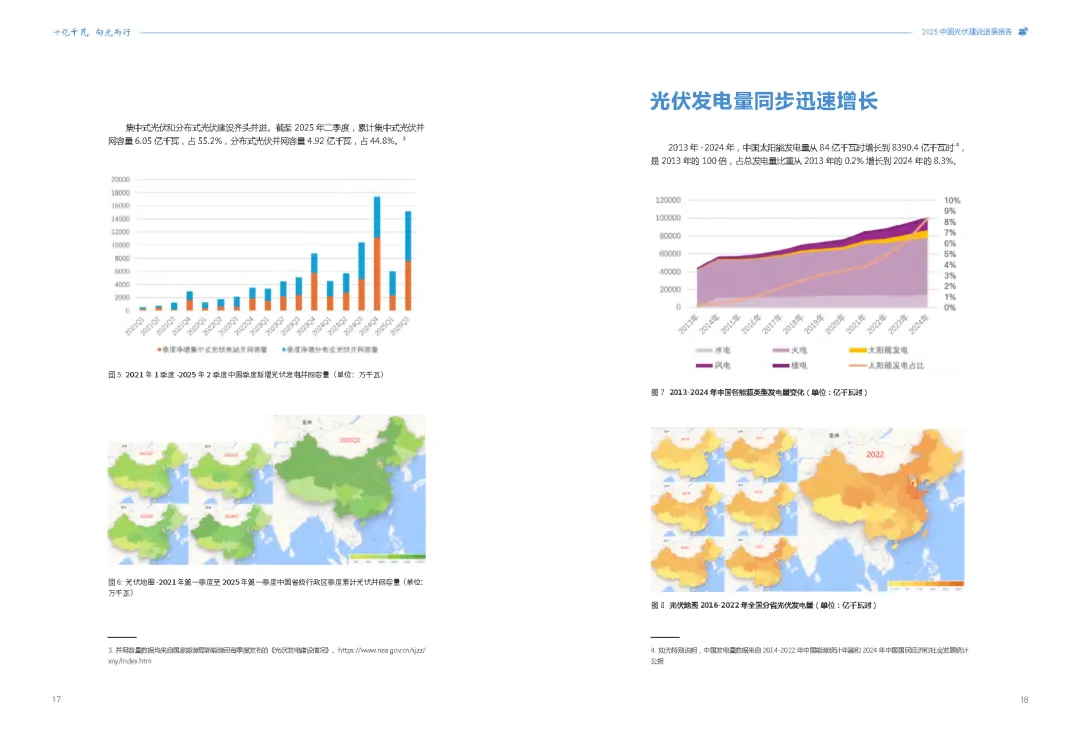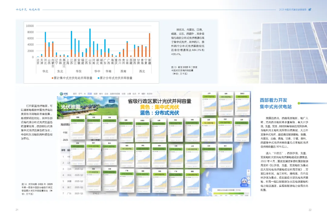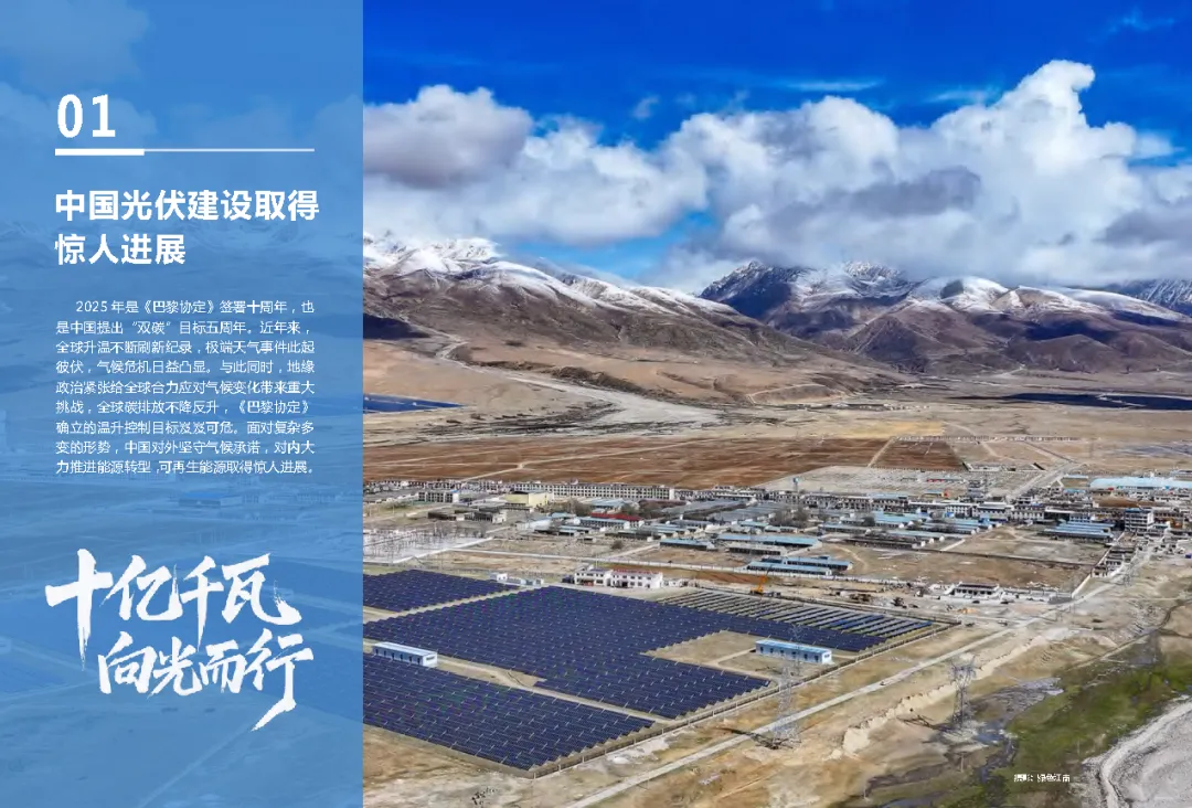 在应对全球气候变化的紧迫背景下,中国光伏产业正以惊人的速度改变着能源版图。《2025年中国光伏建设发展报告——十亿千瓦 向光而行》深度剖析了中国光伏产业的迅猛发展态势,揭示了其在全球能源转型中的核心地位。从东中部的分布式光伏如星辰般点缀城乡,到西部广袤的集中式光伏电站如蓝色海洋般铺展,中国光伏总装机量已突破11.1亿千瓦,占全球总量的近半壁江山,提前六年实现了气候雄心目标。这份报告不仅是对中国光伏成就的全面总结,更是对未来能源发展趋势的深刻洞察。