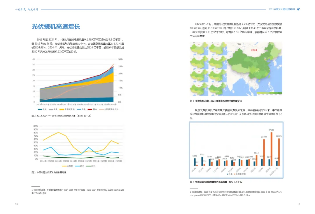 报告显示,截至2025年7月,中国光伏总装机量已达11.1亿千瓦,同比增长50.8%,占全国总装机量的26.48%。这一数字不仅远超全球其他国家和地区,更在短短十年间实现了从1589万千瓦到11.1亿千瓦的飞跃,年均增速高达44%。中国光伏新增装机量连续十一年蝉联全球首位,2024年新增装机量占全球总量的61.24%,为全球能源转型提供了强大动力。