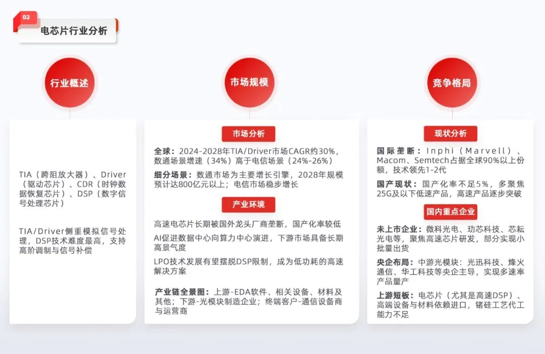 全球市场:数据中心架构升级推动高速TIA/Driver需求,2024-2028年TIA和Driver市场规模复合增长率均超30%;LPO方案2025年Q1商用量产,2025-2027年渗透率30%-70%,CPO方案2027-2028年小规模量产或导致公开流通市场萎缩5-10%。