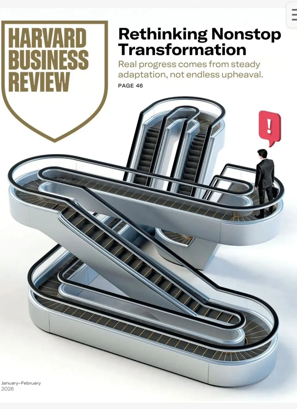 主编Amy Bernstein在卷首语中提出了一个振聋发聩的问题:"所有这些转型真的有必要吗?" 文章引用贝恩公司的研究指出,企业应避免陷入"转型跑步机"的陷阱,转而学习自然生态的适应性,通过"感知变化并按需调整"来应对挑战。
