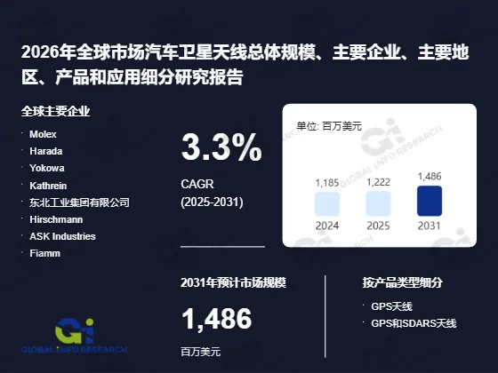 据调研数据显示,按收入计,2025年全球汽车卫星天线收入大约1222百万美元。(数据来源:《2026年全球市场汽车卫星天线总体规模、主要生产商、主要地区、产品和应用细分研究报告》 出版商:环洋市场咨询(Global Info Research))