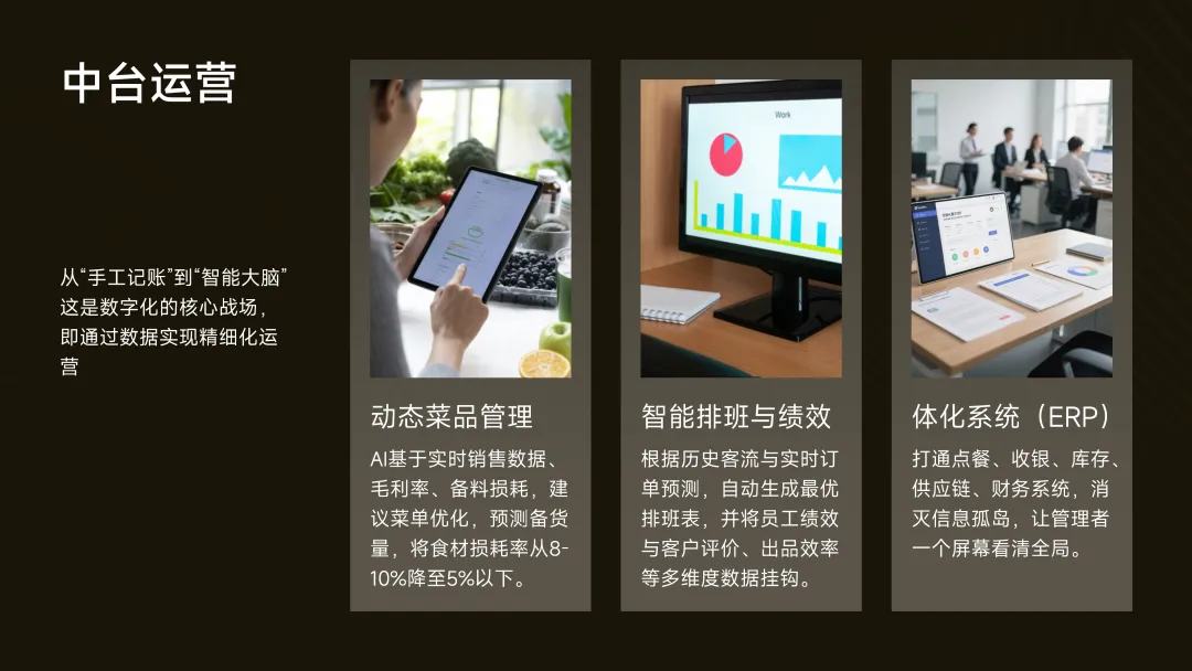 ·一体化系统(ERP):打通点餐、收银、库存、供应链、财务系统,消灭信息孤岛,让管理者一个屏幕看清全局。