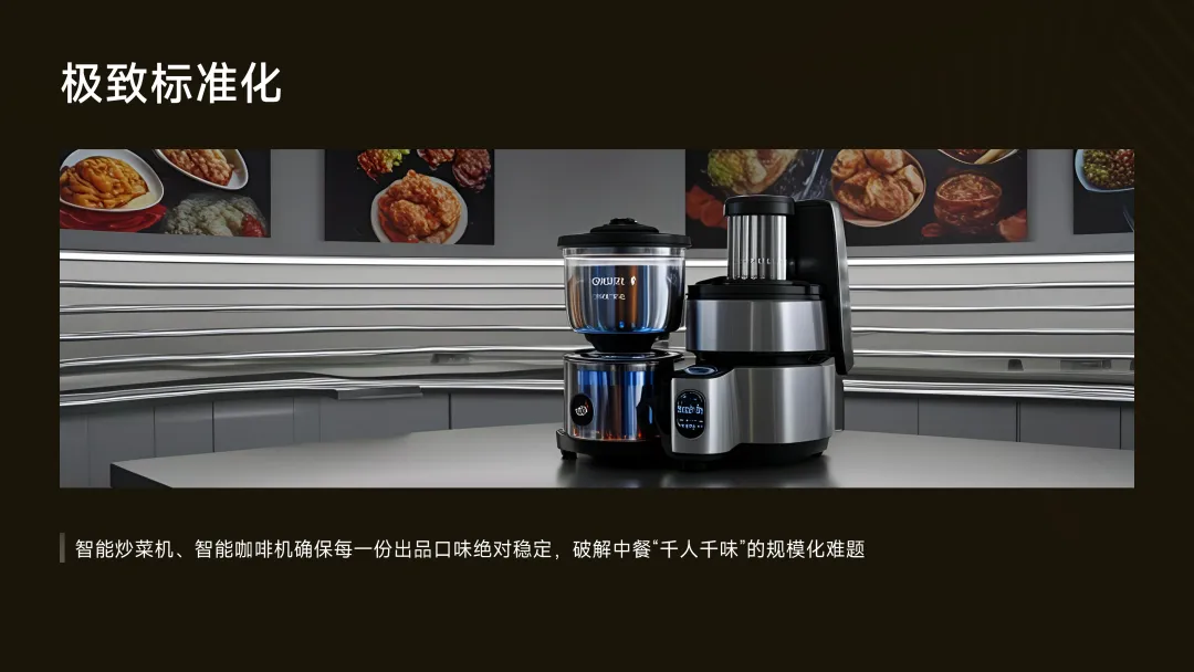 ·极致标准化:智能炒菜机、智能咖啡机确保每一份出品口味绝对稳定,破解中餐“千人千味”的规模化难题。
