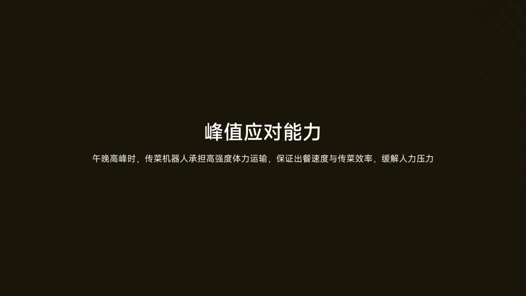 ·峰值应对能力:午晚高峰时,传菜机器人承担高强度体力运输,保证出餐速度与传菜效率,缓解人力压力。