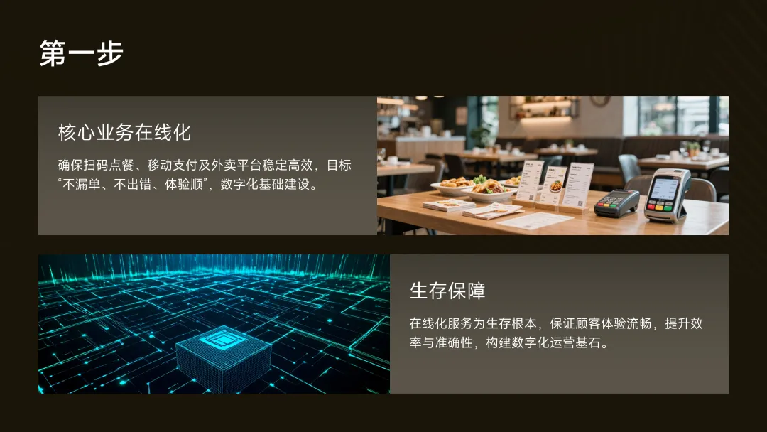 1.第一步:核心业务在线化(生存保障)确保扫码点餐、移动支付、主流外卖平台入驻稳定高效。这是数字化的“入场券”,目标是“不漏单、不出错、体验顺”。