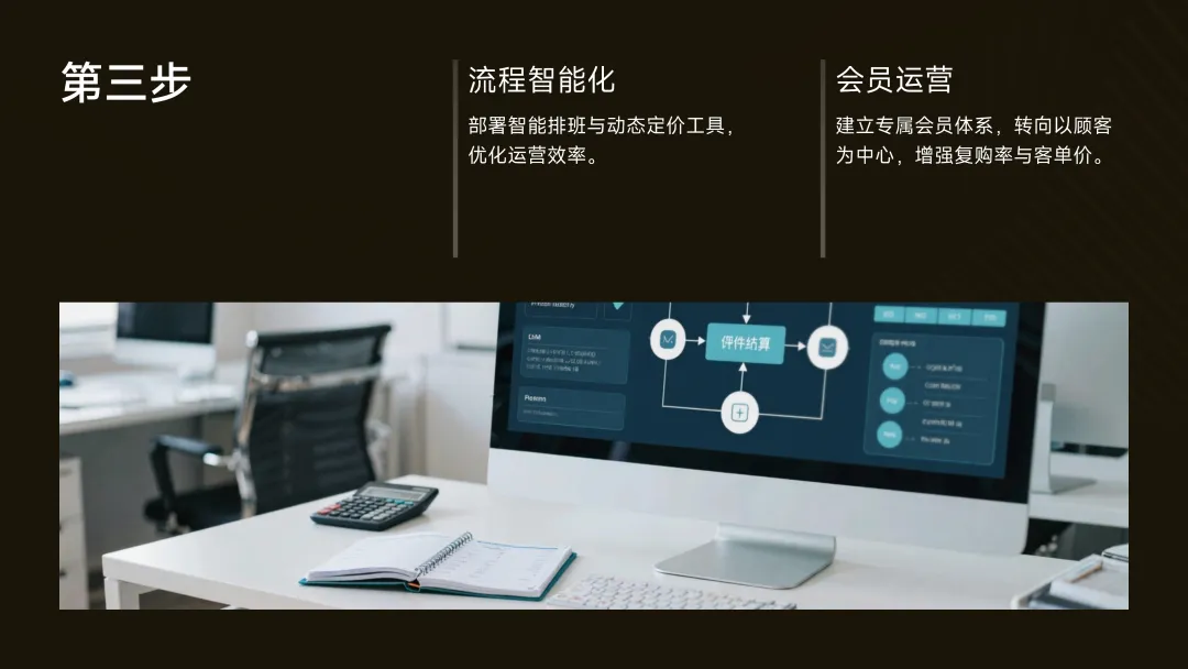 3.第三步:流程智能化与会员运营(竞争力构建)部署智能排班、动态定价工具,并建立自己的会员体系。目标是从“经营产品”转向“经营顾客”,提升复购与客单价。
