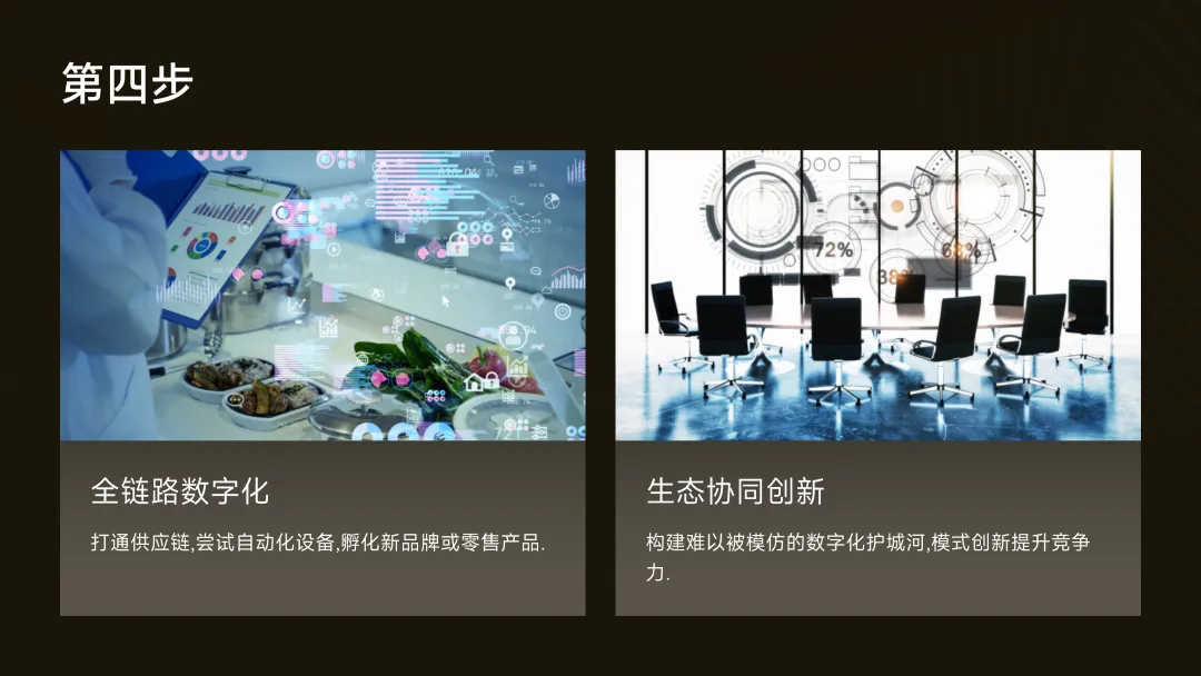 4.第四步:全链路数字化与生态协同(模式创新)打通供应链,尝试自动化设备,甚至基于数据孵化新品牌或零售产品。目标是构建难以被模仿的数字化护城河。
