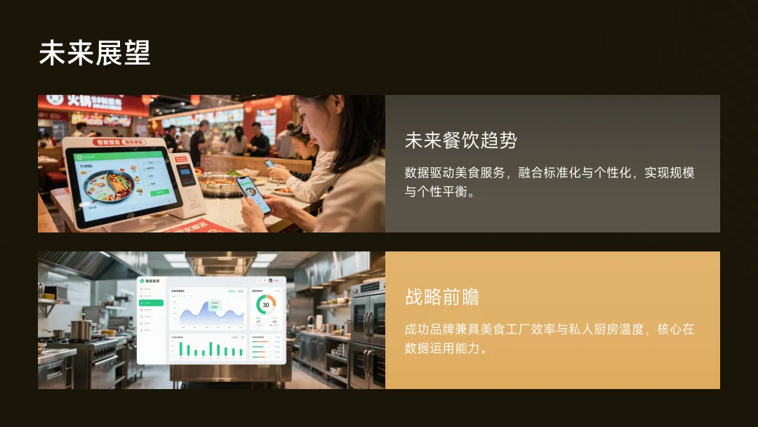 战略前瞻:未来的成功餐饮品牌,将兼具“美食工厂”的标准化效率与“私人厨房”的个性化温度。其核心竞争力是:利用数据,在规模化与个性化之间找到最佳平衡点的能力。