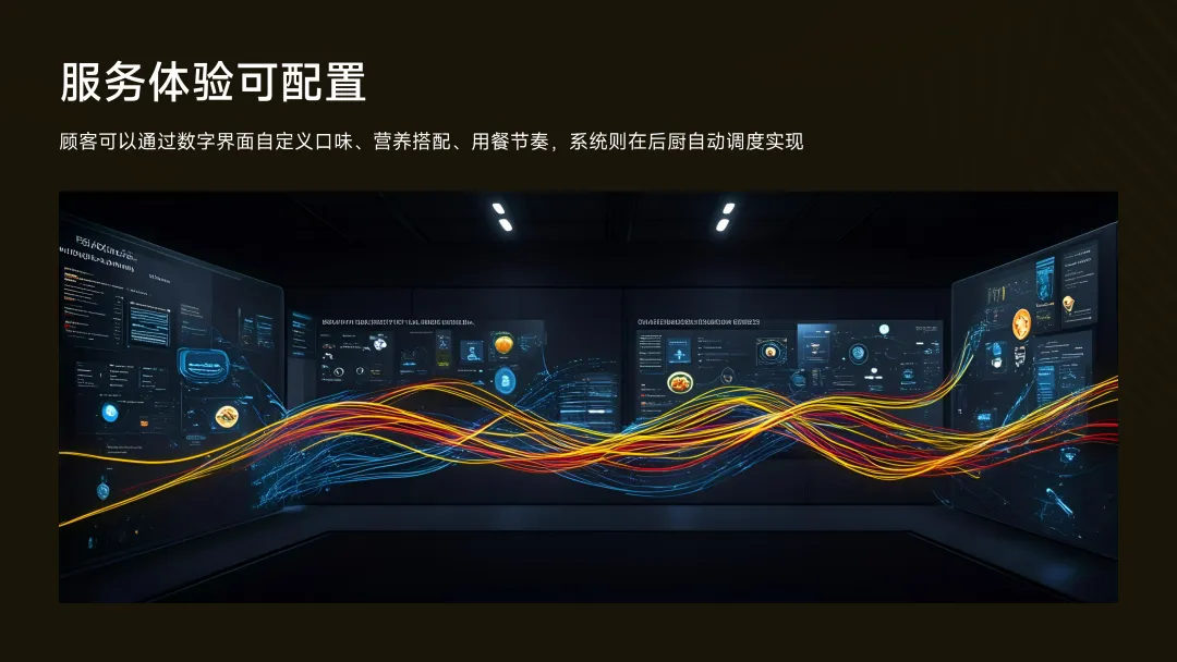 ·服务体验可配置:顾客可以通过数字界面自定义口味、营养搭配、用餐节奏,系统则在后厨自动调度实现。