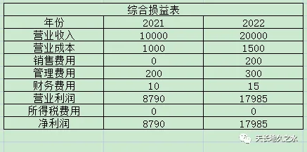 营业收入,和营业成本我就不多介绍了,大家都知道。我这里专门加了一个难度,就是大家会发现为什么第二年不是2000?而是1500。因为第二年你和卖肉的和白面的商家建立了良好的关系,所以2022年他们愿意给你更低的价格拿货,因此第二年的营收赚了一倍,而成本却只上升了一点。