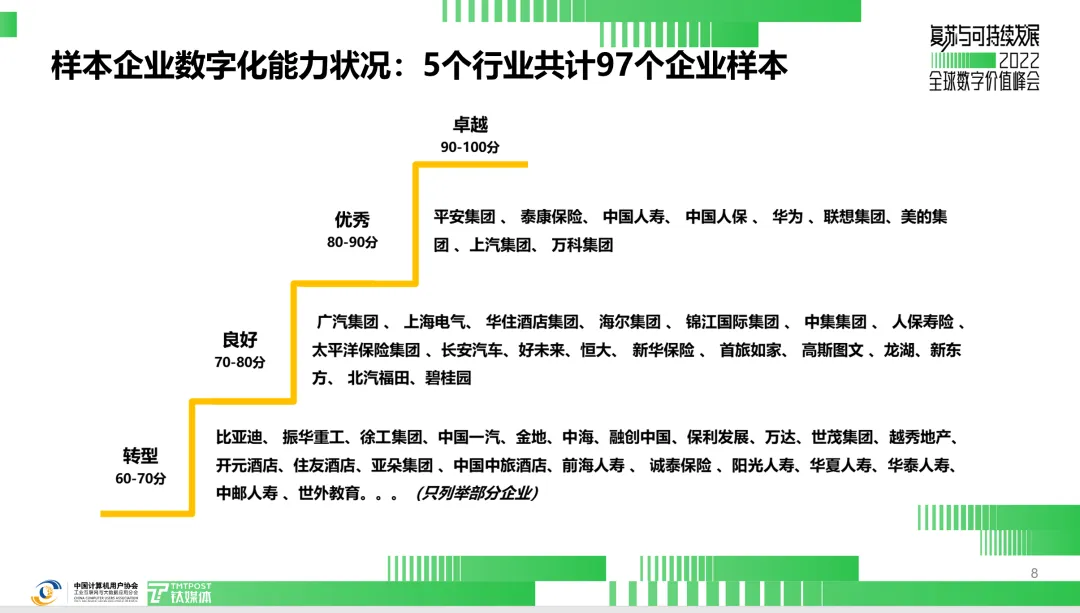 会上,主办方联合钛媒体研究院共同发布了《中国企业数字化能力观察》报告(以下简称报告),共有五大行业的97家企业接受了数字化能力调研,联想数字化能力以81.13分,与华为、平安等9家企业同处“优秀”的水平。