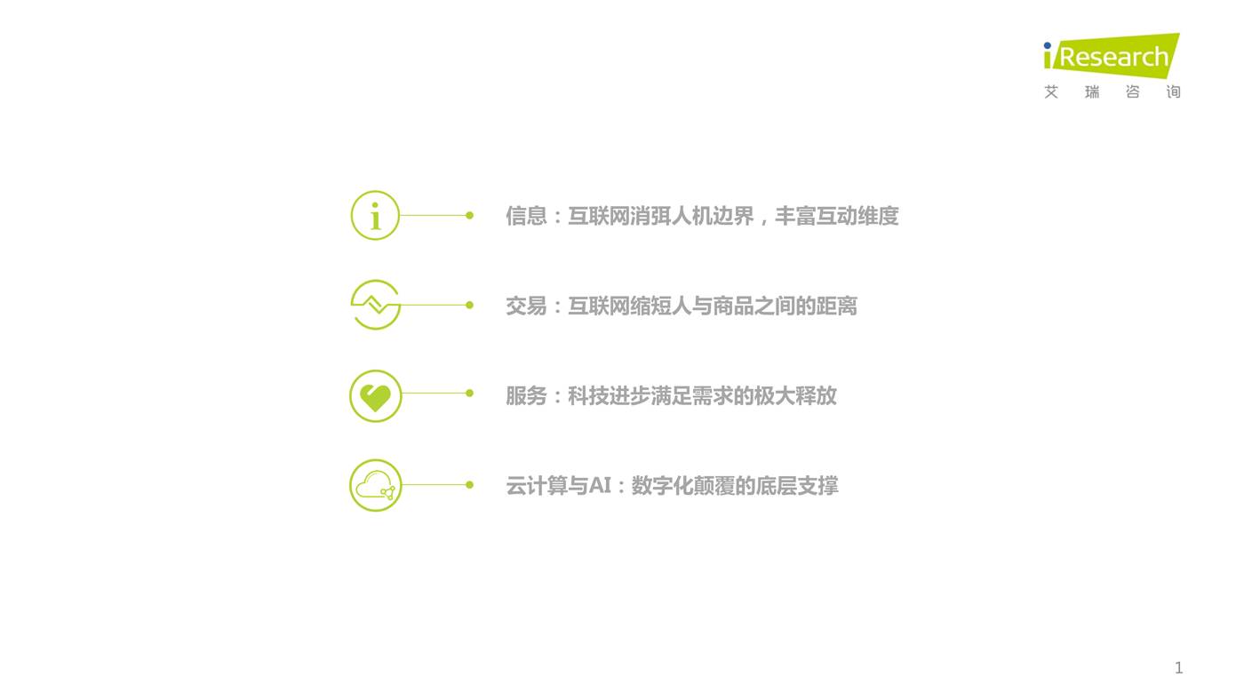 基于艾瑞大数据研究方法整理得出的趋势报告,观察互联网的角色变迁、互联网对信息、交易、服务的影响、以及新科技带来的行业裂变。报告内容涵盖社交、视频、广告、金融、电商、O2O、文娱游戏、云计算及人工智能等垂直领域的总结,并对人工智能在行业的应用前景,进行了大胆的想象。