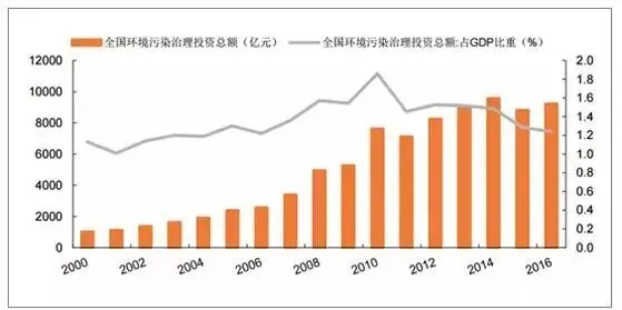 2000-2016年,我国环境治理投资总额从1014.90亿元增长至2016年的9219.80亿元,复合增速达14.79%。2016年,我国环境治理投资占GDP比例为1.24%。根据国际经验,当治理环境污染的投资占GDP的比例达1%~1.5%时,可控制环境恶化的趋势,当该比例达到2%~3%时,环境质量可有所改善。发达国家在20世纪70年代环境保护投资占GDP的比例已达2%《全国城市生态保护与建设规划(。2015-2020年)》提出,到2020年,我国环保投资占GDP的比例不低于3.5%,环保投资仍有很大提升空间。