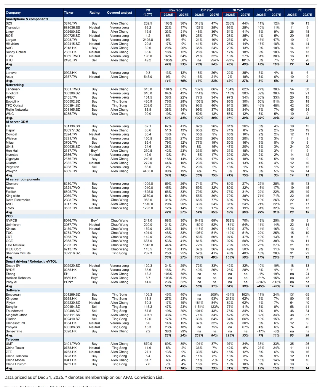 尽管存储成本上涨是潜在下行风险,但我们认为高端品牌和可折叠手机等功能偏好为相关零部件供应商提供了韧性,因为消费者对价格敏感度较低。在此背景下,买入标的:ZS (hinges), Largan (lens), AVC (vapor chamber), Hon Hai (on CL; ODM), FII (metal middle frame), AAC (acoustics), BYDE (metal middle frame), Lingyi (metal precision parts)。
